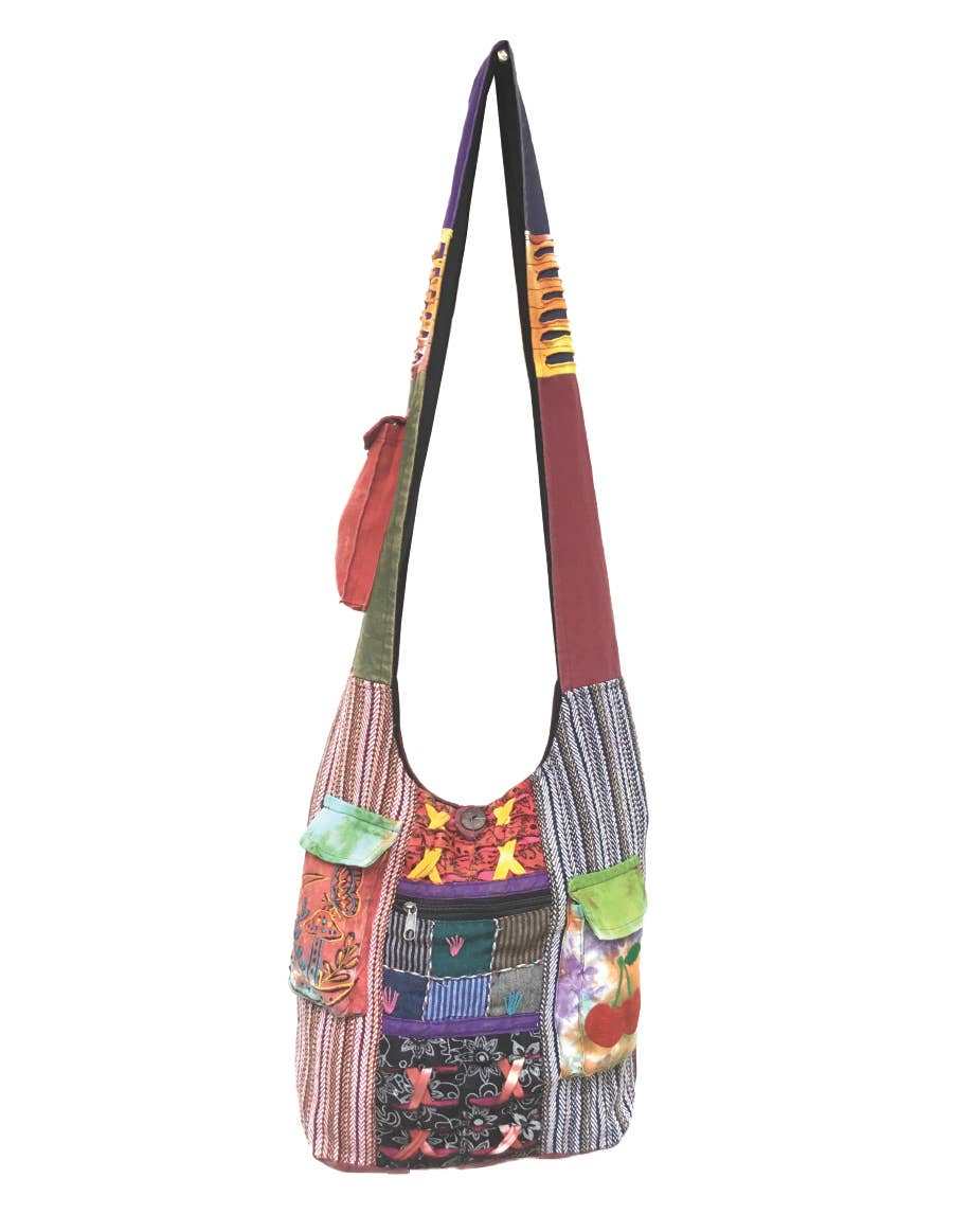 Mini borsa hobo tribale ricamata con funghi e pace