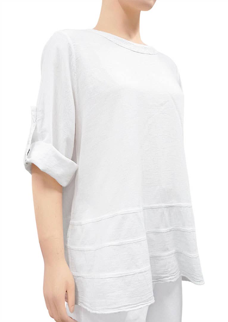 Il top in cotone Fabiola presenta una silhouette lusinghiera che esalta il tuo fascino femminile. Le maniche a 3/4 a balze aggiungono un tocco di fantasia, che ondeggia dolcemente ad ogni movimento. Una scollatura rotonda incornicia il viso con sottile grazia, evidenziando la tua bellezza naturale. Il delicato ricamo in cotone adorna sia il corpo che le maniche, aggiungendo una trama complessa e un tocco di incanto al look generale.