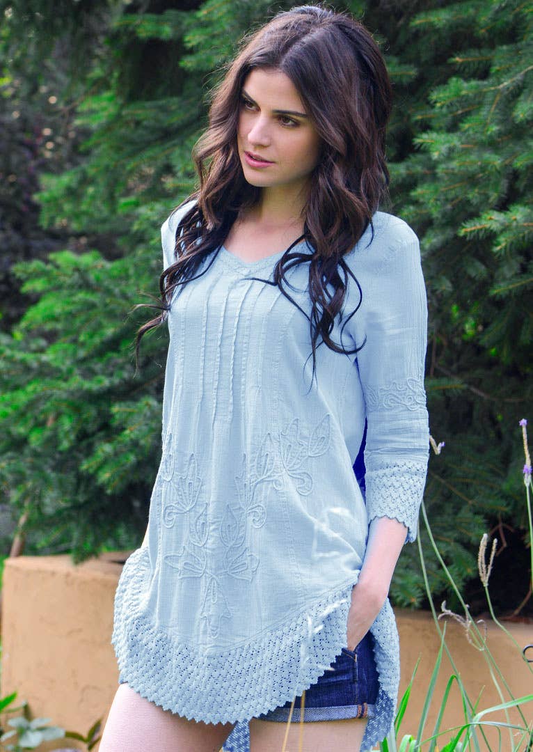 SKU: S17-097-LIGHT-BLUE-S Paese di produzione: Perù Decorazioni: Ricamata Istruzioni di lavaggio: Lavaggio in lavatrice Lunghezza delle maniche: Maniche a 3/4 Motivo: Floreale Scollo: Collo rotondo Stagione: Primavera/Estate Stile: Bohémien e Romantico/stravagante Tessuto: 100% cotone peruviano. Vestibilità: Di tendenza Lingua del prodotto: Inglese Peso: 181,44 g (6,4 oz)