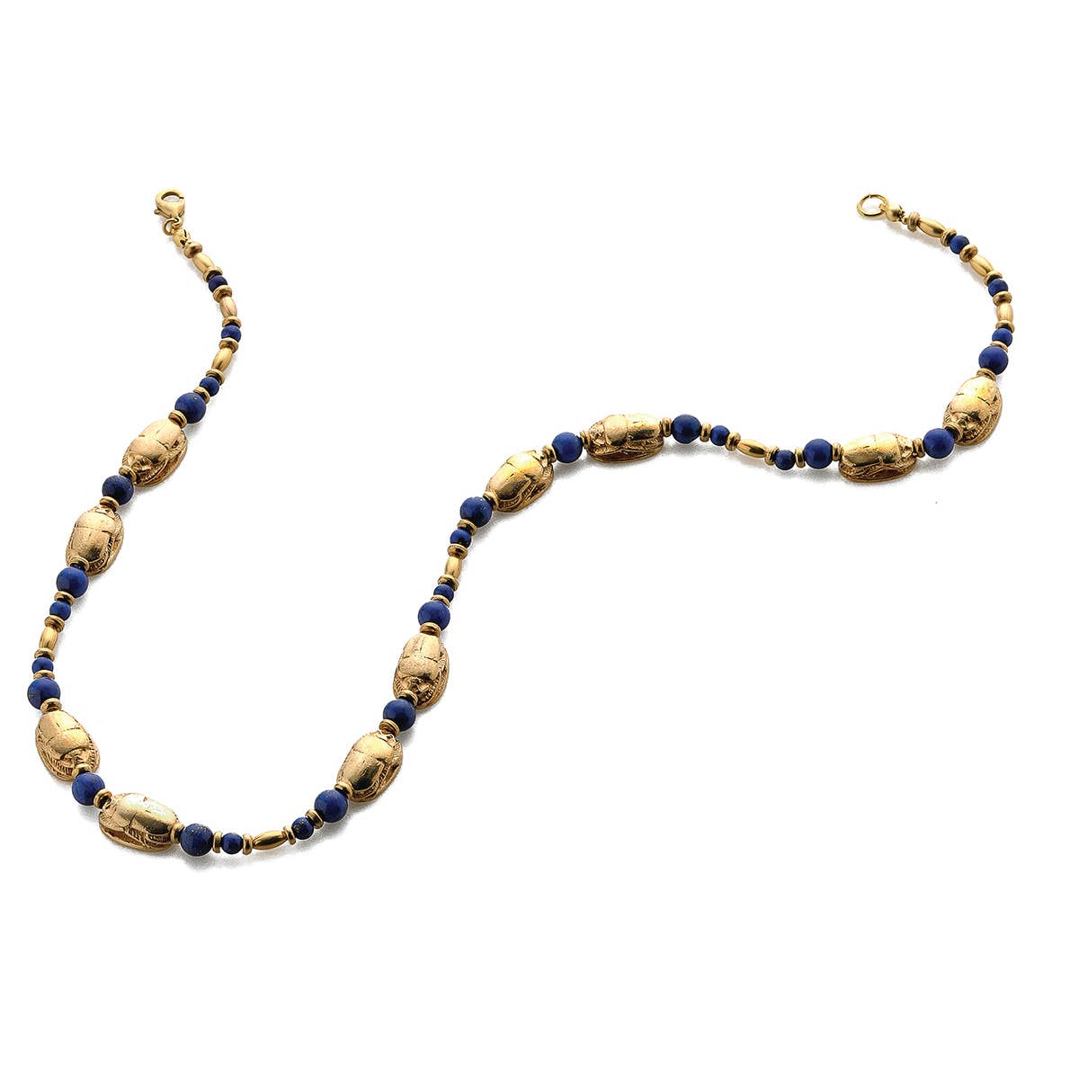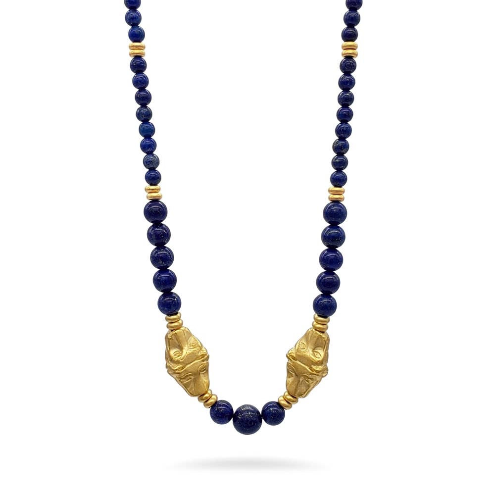 Gli antichi egizi attribuivano un grande significato religioso alla combinazione di lapislazzuli e oro e all'umile scarabeo scarabeo, simbolo di risurrezione e vita eterna. Si credeva che le insegne in oro e lapislazzuli mettessero chi le indossava sotto la protezione del sole e del cielo. L'oro era considerato un metallo divino relativo all'antico dio del sole egizio, Ra. Si pensava che il lapislazzuli fosse una pietra sacra, il suo significato celeste rappresentato nel ricco colore blu di questa pietra. Materiali: perle di lapislazzuli graduate, perle scarabeo in peltro con finitura oro, chiusura a moschettone Lunghezza: 18" Confezione regalo inclusa