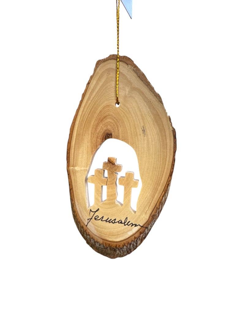 Addobbo intagliato in legno d'ulivo con tre croci