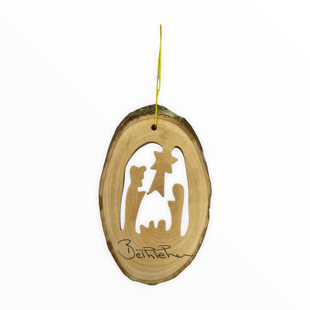 Aggiungi un tocco speciale alle festività di quest'anno con gli addobbi in legno d'ulivo. Questo design unico è stato intagliato a mano esclusivamente a Betlemme, nella Terra Santa, usando un seghetto alternativo. L'ornamento conserva la corteccia naturale dell'olivo e varia nelle dimensioni. Include un filo dorato ed è pronto da appendere. Dimensioni: Altezza: 11,4 cm Larghezza: 5,7 cm