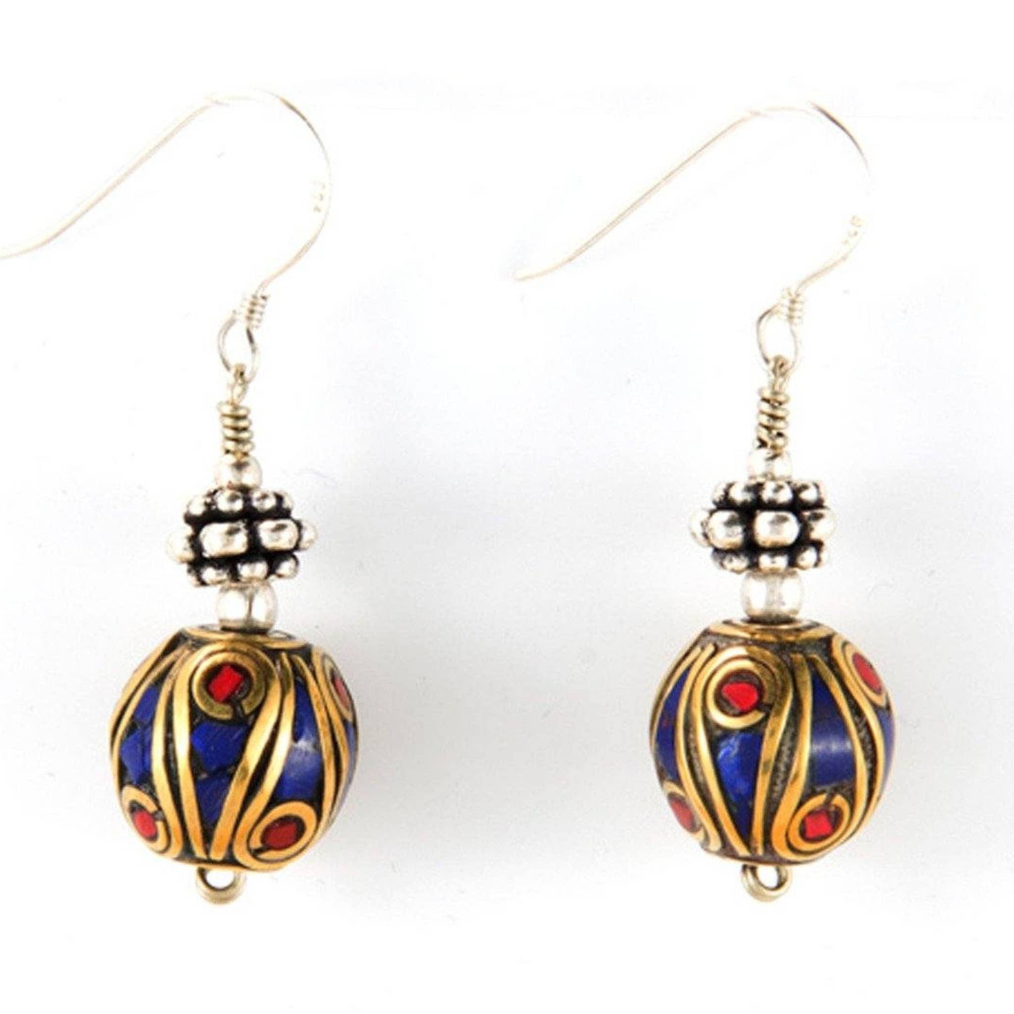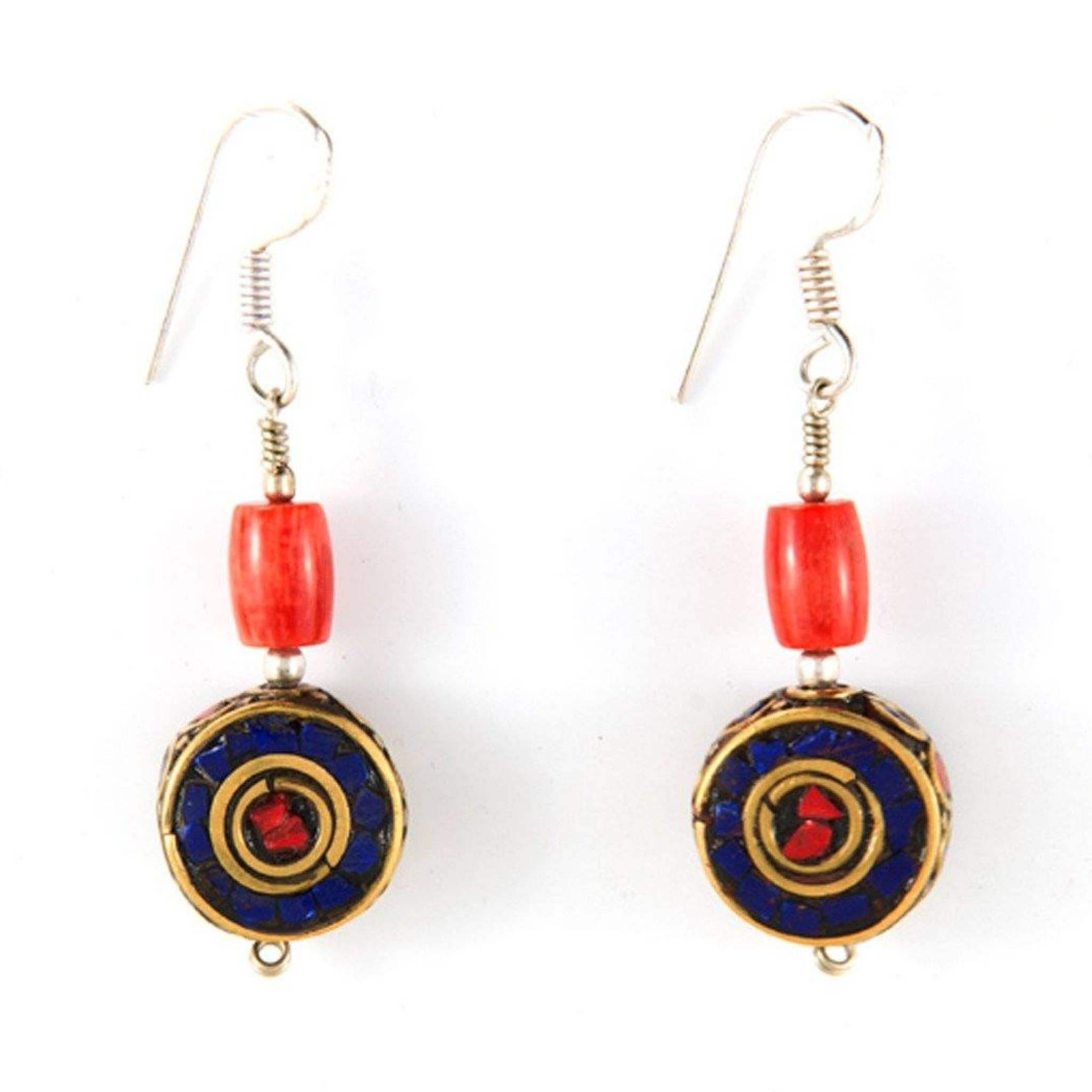 Orecchini tibetani realizzati con tradizionale perla tibetana in ottone intarsiata con lapislazzuli e corallo. Sormontato da una perla di corallo. Materiali: Orecchino rotondo in ottone con lapislazzuli e scaglie di corallo, sormontato da una perla di corallo. Lunghezza: 50 mm di lunghezza Fatto a mano in Nepal: può contenere lievi variazioni