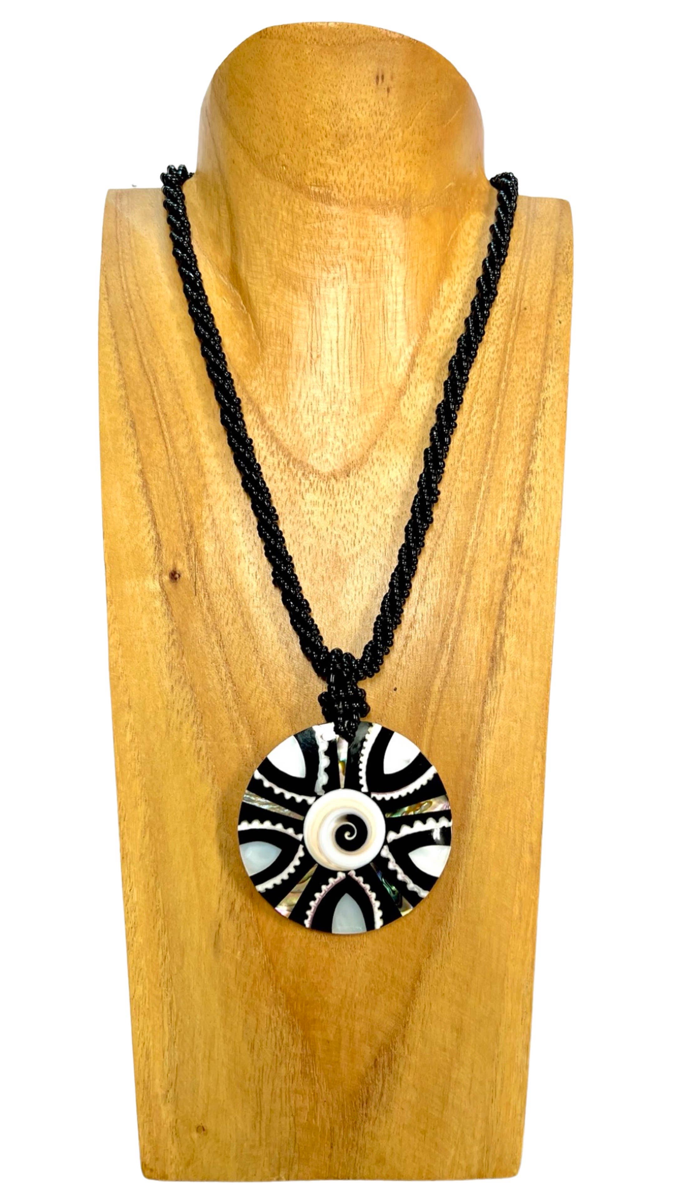 Conchiglia a spirale intagliata in madreperla su una collana di perline in ceramica nera intrecciata. Lunghezza 18". Orecchini coordinati disponibili.