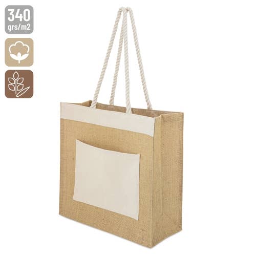 Nuova borsa in cotone e base in juta con tasca e manico lungo personalizzabile. Il manico lungo è realizzato in cotone riciclato da 320 g/m² e base in juta. Dimensioni della borsa: 47,5 x 14 x 35,5 cm Dimensioni della tasca: 27 x 18,8 cm