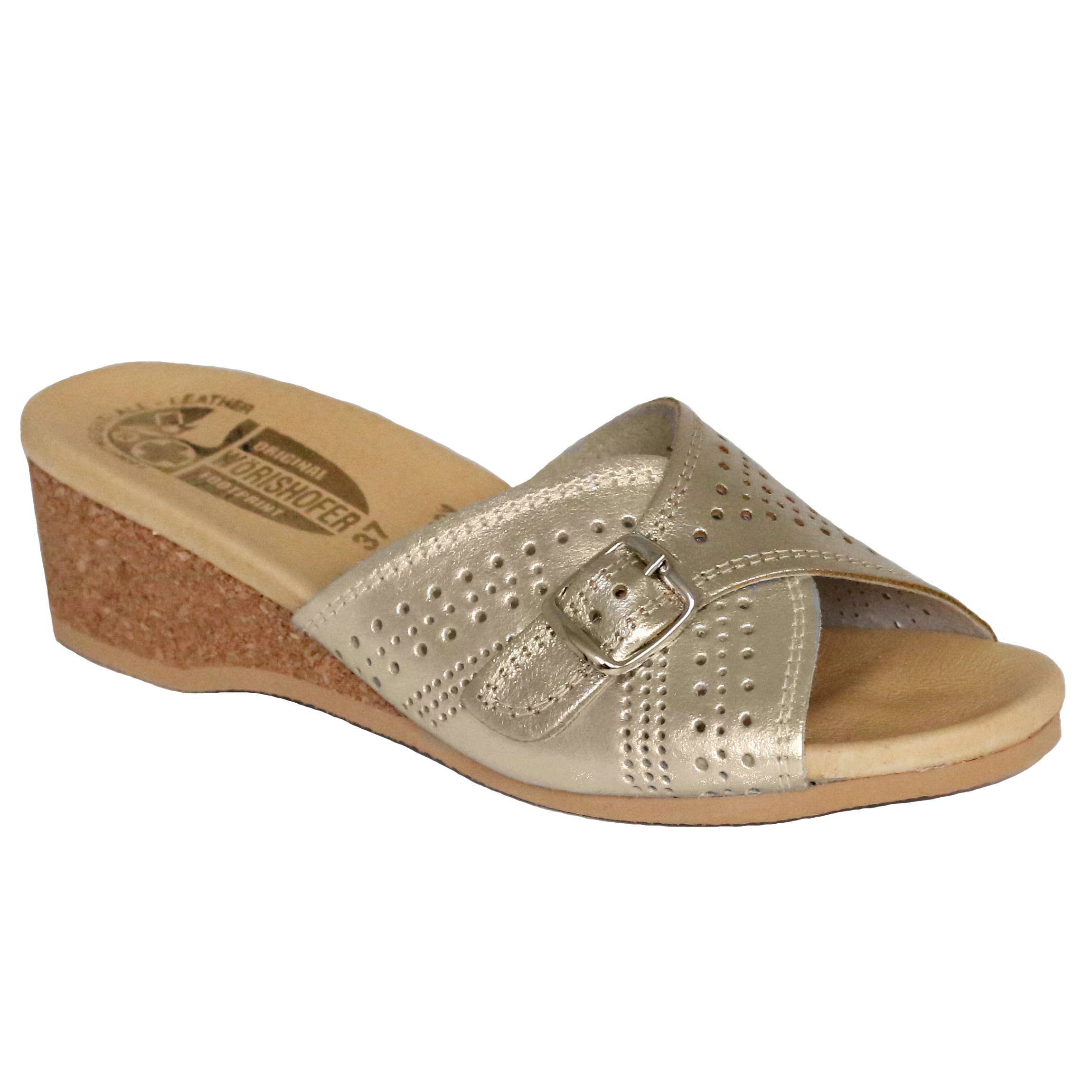 Sandali con tomaia in pelle blu denim traforata, chiusura con fibbia regolabile, suola in sughero e gomma, comfort ultra vintage appena fuori dagli schemi!