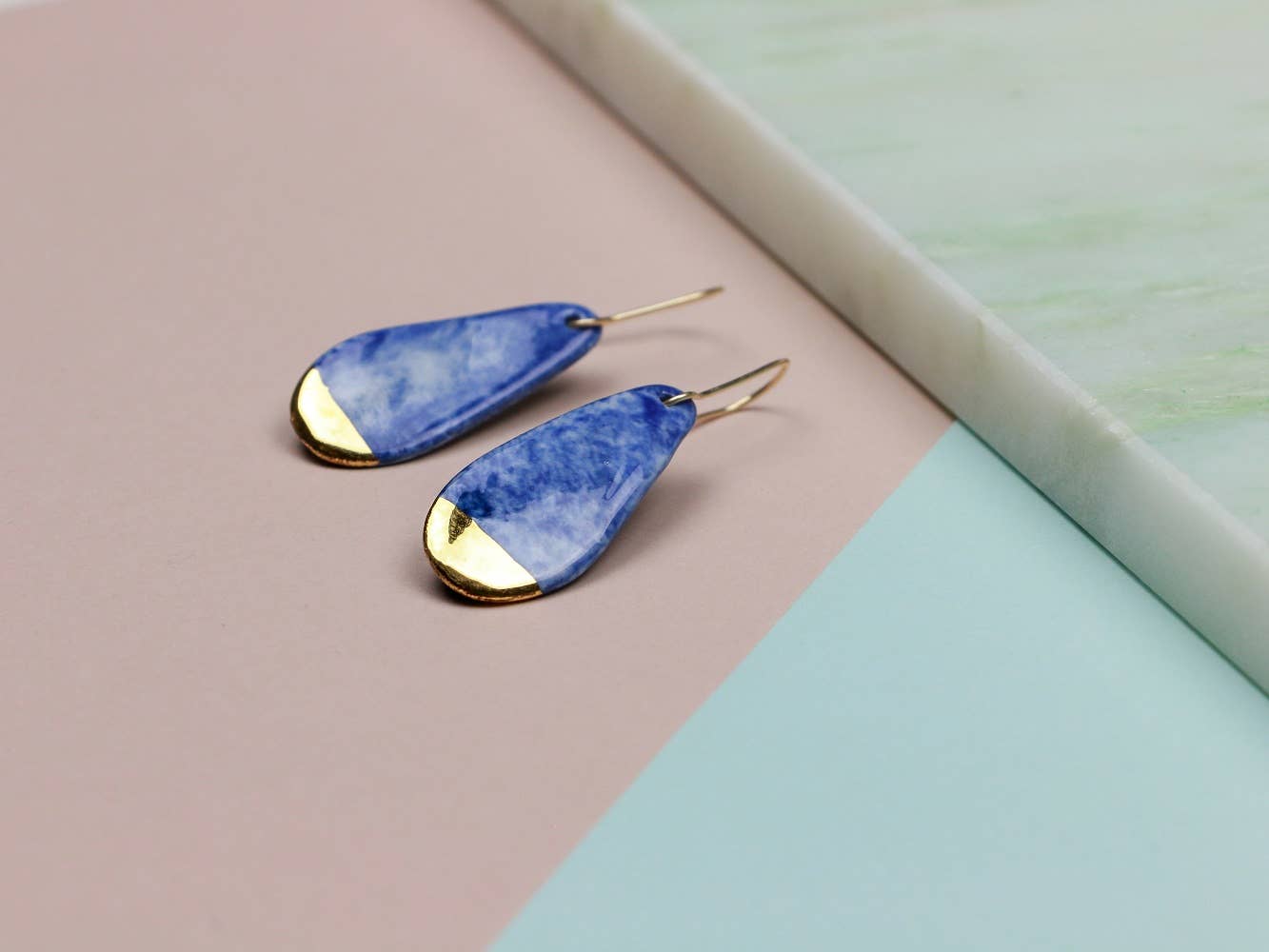 Tutti i gioielli Rozenthal sono realizzati a mano dall'inizio alla fine. Non esistono due pezzi identici e queste variazioni rendono ogni pezzo un'opera d'arte originale. MATERIALE E DIMENSIONI *Porcellana dipinta a mano con lucentezza oro 24k. * Ganci riempiti in oro 14k - senza nichel *Leggero: 4 g * Dimensioni: 35 x 15 mm (1,38 x 0,59 pollici)