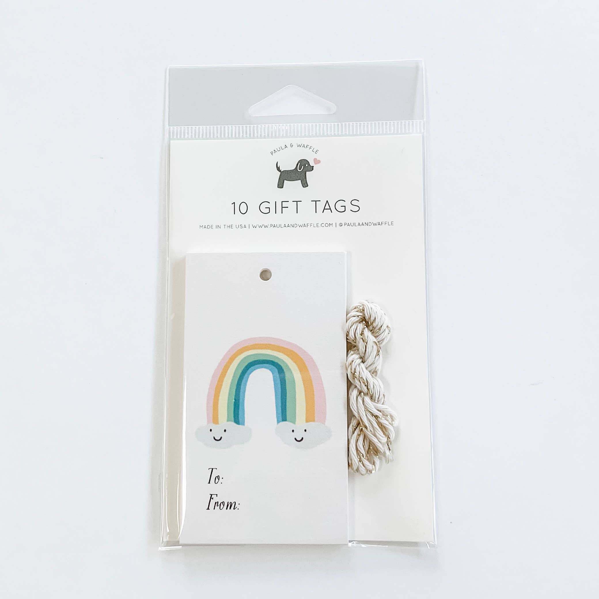 5,1 x 8,9 cm /spago incluso. Stampato su cartoncino bianco naturale e confezionato in set da dieci.