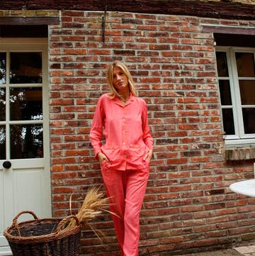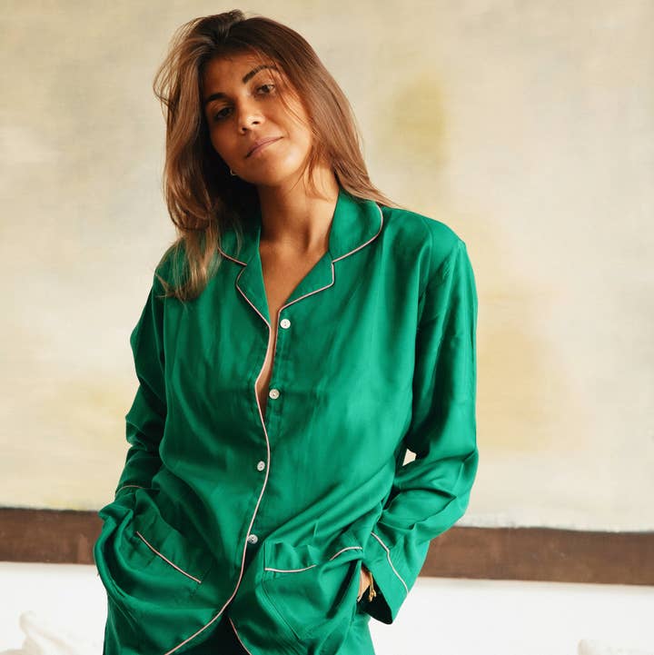 Innamorati del pigiama Camille in cotone 100% stampato. La sua forma classica ed elegante, con bordi gialli a contrasto e tasche applicate, si adatta a tutti i tipi di corporatura. Il pigiama viene consegnato in una pochette abbinata.