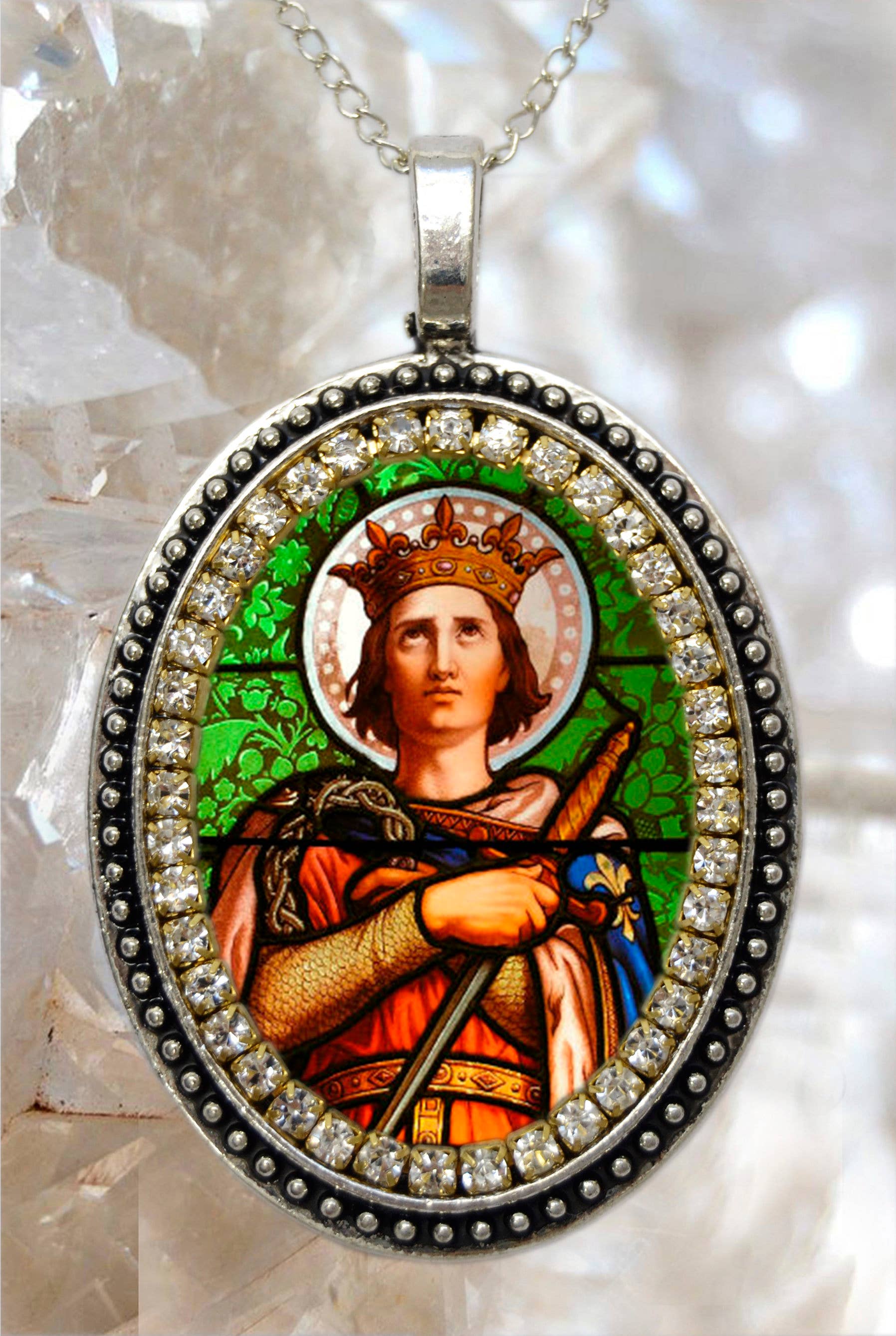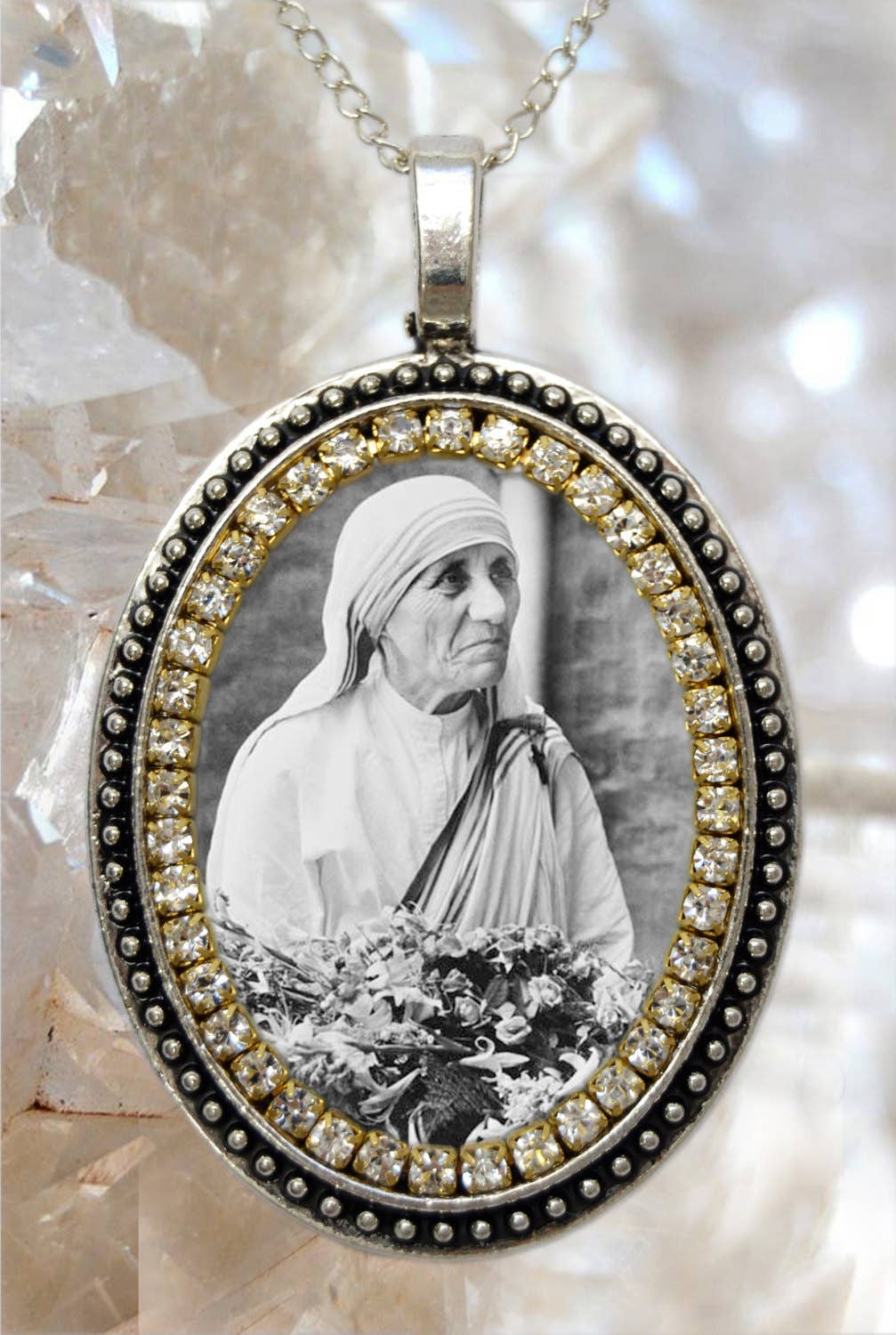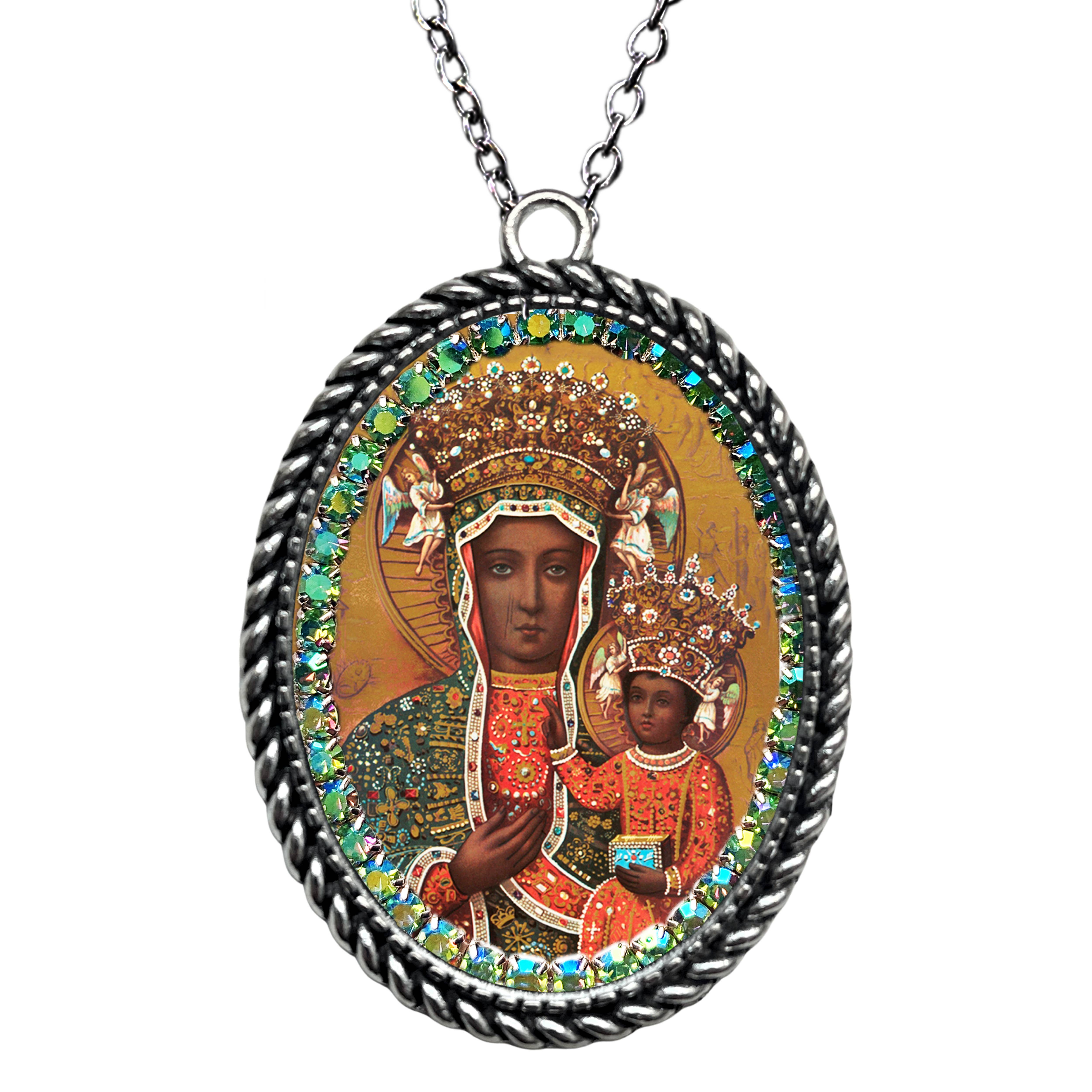 Abbraccia il fascino mistico dell'anima gitana con l'esclusiva collana «Spirit of the Gipsy - Saint Sarah Kali» di Maria Santissima Shop. Dal design intricato con un tocco vittoriano e decorata con un caleidoscopio di strass scintillanti, questa collana cattura il cuore delle tradizioni rom e l'essenza della loro patrona celeste, Santa Sarah Kali. . Creato con: Bellissimo ciondolo grande 57x37 mm con un'immagine di Santa Sarah Kali con strass verdi, bianchi, blu o rosa (vedi opzioni). Questo ciondolo è dotato di una catena in acciaio inossidabile