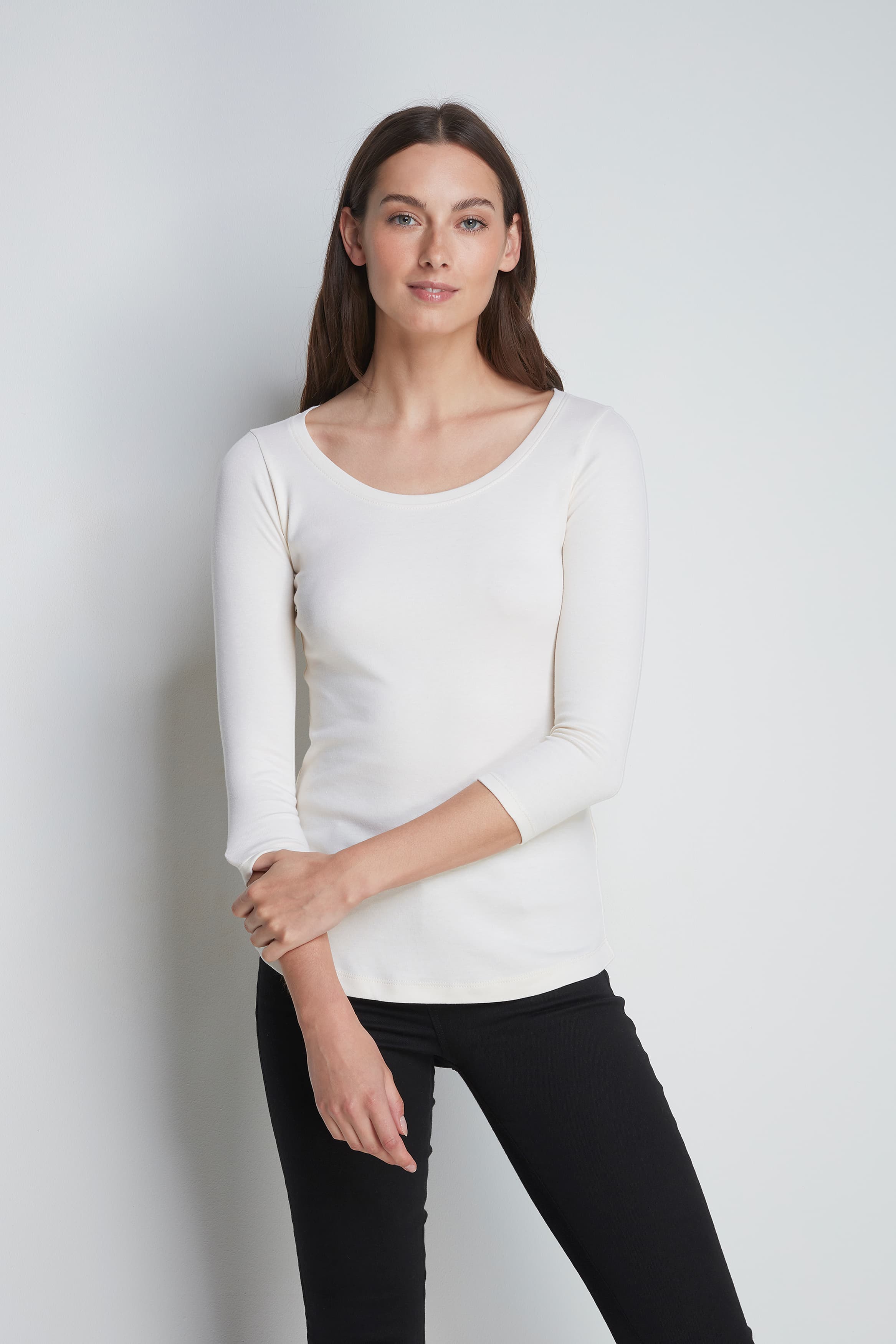Aria senza sforzo e elegantemente sobria, la nostra T-shirt girocollo in cotone Supima è progettata pensando all'estate. Realizzata con lo stesso cotone Supima premium e traspirante del nostro tank più amato, presenta una silhouette ampia a trapezio che si drappeggia dolcemente per il massimo comfort nei climi più caldi. Dettagli di cucitura delicati intorno al collo, alle maniche e all'orlo aggiungono un tocco di texture ponderato, mentre la lunghezza leggermente estesa delle maniche offre una copertura lusinghiera e ariosa. Leggera ma non trasparente, anche in bianco, questa maglietta è il basico perfetto e raffinato per un abbigliamento estivo rilassato.