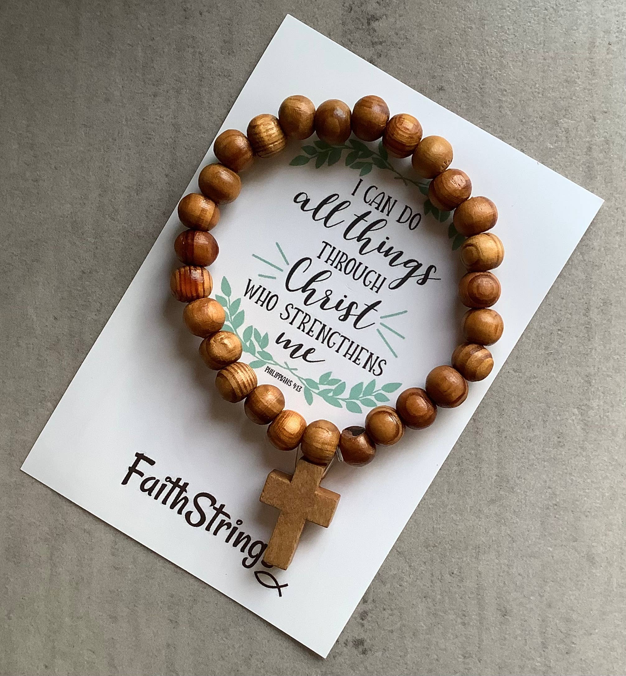 Bracciale elastico Christian con perline in legno naturale. Perline rotonde da 8 mm (0,33 pollici) con quattro perline caratterizzate da croci. Queste ultime perle hanno un diametro di 10 mm (0,4 pollici). Il bracciale ha anche una croce in legno che misura 21 x 15 mm (0,85 x 0,57 pollici). Le carte di supporto dicono «Sii veramente felice che ci sia una gioia meravigliosa davanti» 1 Pietro 1:6 I bracciali sono confezionati in cellophane. Un ottimo regalo cristiano a basso costo.