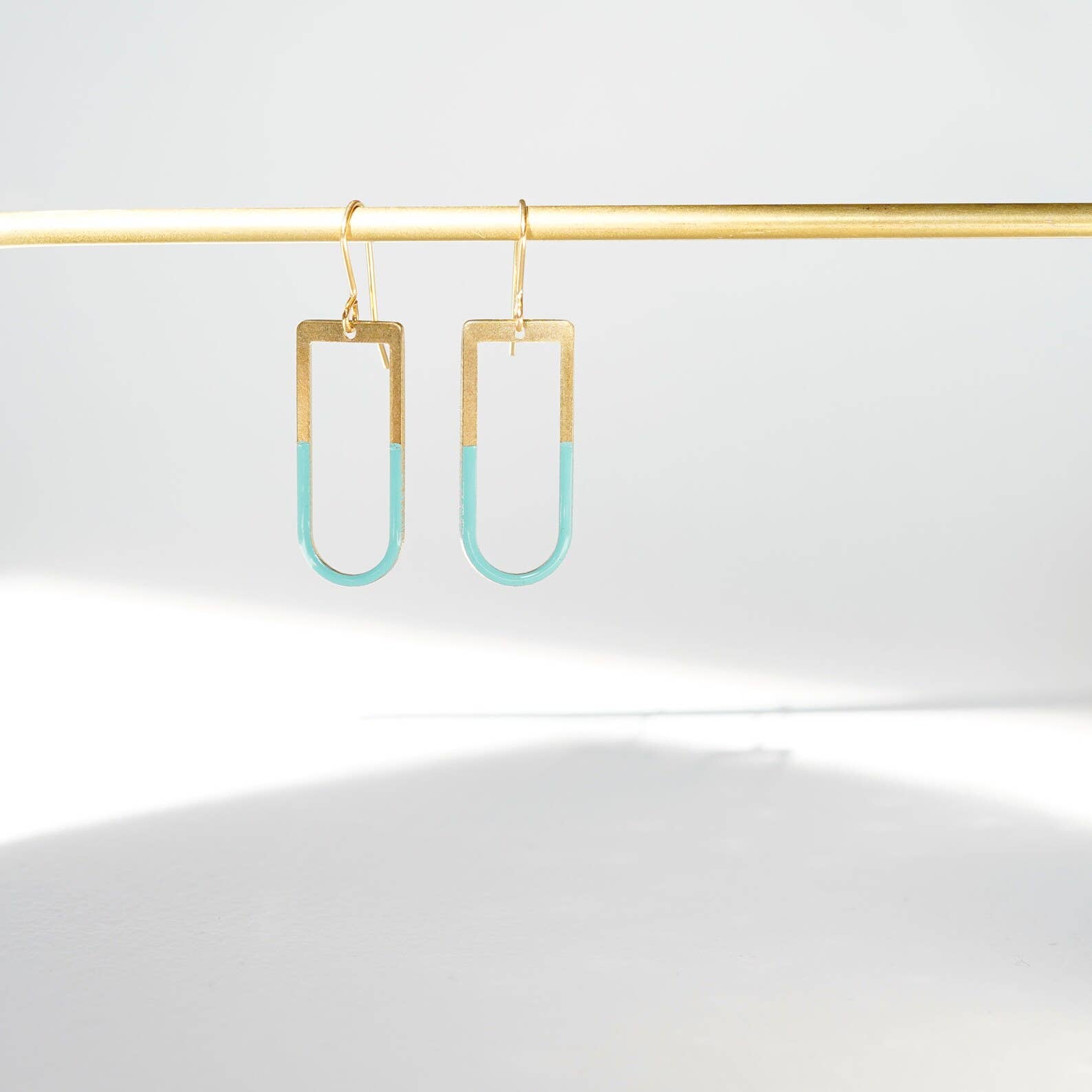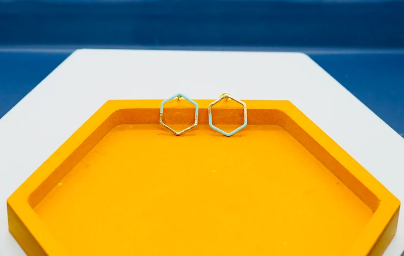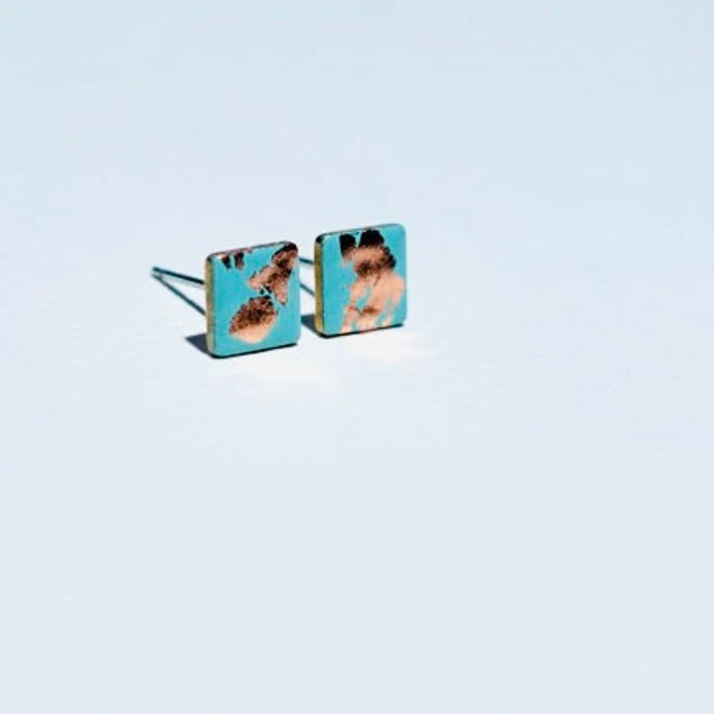 Uno splendido paio di orecchini a perno geometrici smaltati di Copper Bee Studio. I piccoli rettangoli in ottone sono smaltati a mano con un colore turchese chiaro e impreziositi da una delicata foglia di rame. Lo smalto offre una finitura lucida, resistente e colorata che si abbina magnificamente con il bagliore della foglia di rame. Ogni paio è unico e accattivante. Ideali come borchie per uso quotidiano/secondo foro, facili da indossare e un bel tocco di colore. DIMENSIONI: Rettangolo: 15 x 8 mm Gli orecchini sono in ottone con acciaio inossidabile, perni ipoallergenici e avranno il retro placcato in oro o argento. Parte della collezione Copper Glow, si prega di vedere altre offerte per gli articoli corrispondenti.