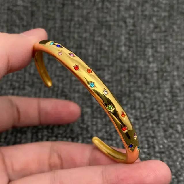 Tipo: bracciale rigido Materiale: acciaio inox 316L, zircone cubico, placcatura in oro 18K Larghezza: 8 mm Diametro interno: 63 mm Processo: elettroplaccatura a vuoto e lucidatura manuale, non si ossida Superficie: alta lucentezza ★ Realizzato in acciaio inox di alta qualità, senza piombo, innocuo per il corpo umano. ★ Regalo di gioielleria perfetto.