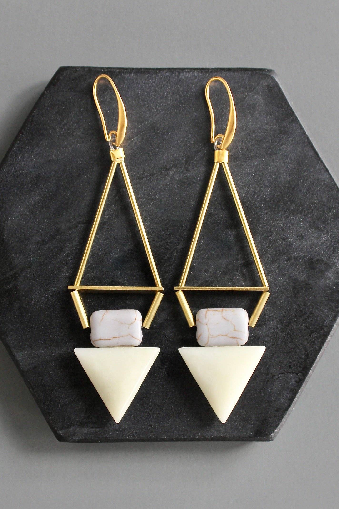 Ganci in ottone placcato oro 18k con vetro ceco, magnesite e barre in ottone. Ogni orecchino pesa 0,39 oz e misura 4,25 pollici in lunghezza dall'alto verso il basso.