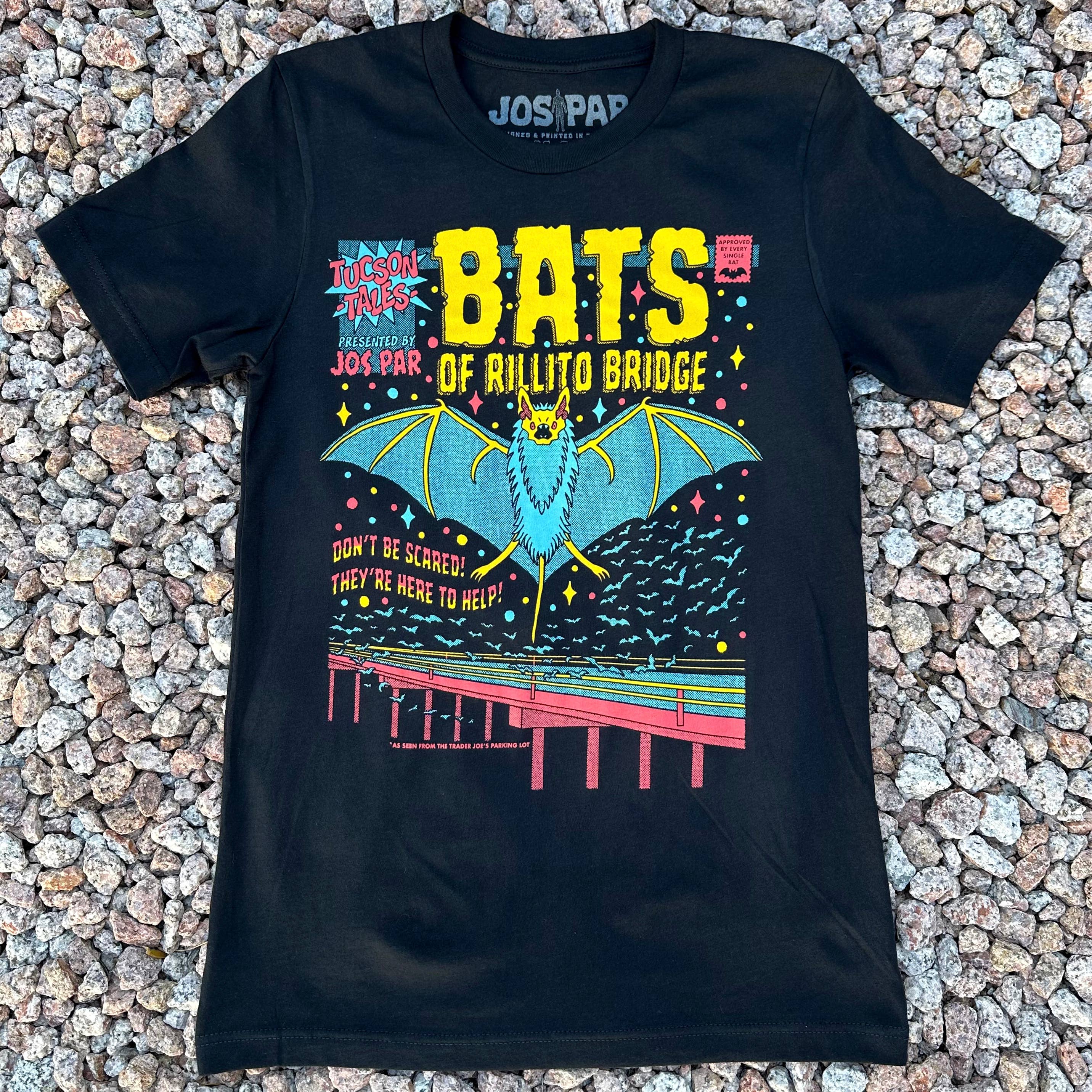 Adesivo in vinile di alta qualità, 6,3 x 7,6 cm. Il testo principale recita «Bats of Rillito Bridge». Resistente all'acqua e alle intemperie. Ottimo per riporre oggetti e mettere bottiglie d'acqua, computer portatili, telefoni, ecc. Progettato da Jos Par a Tucson, AZ.