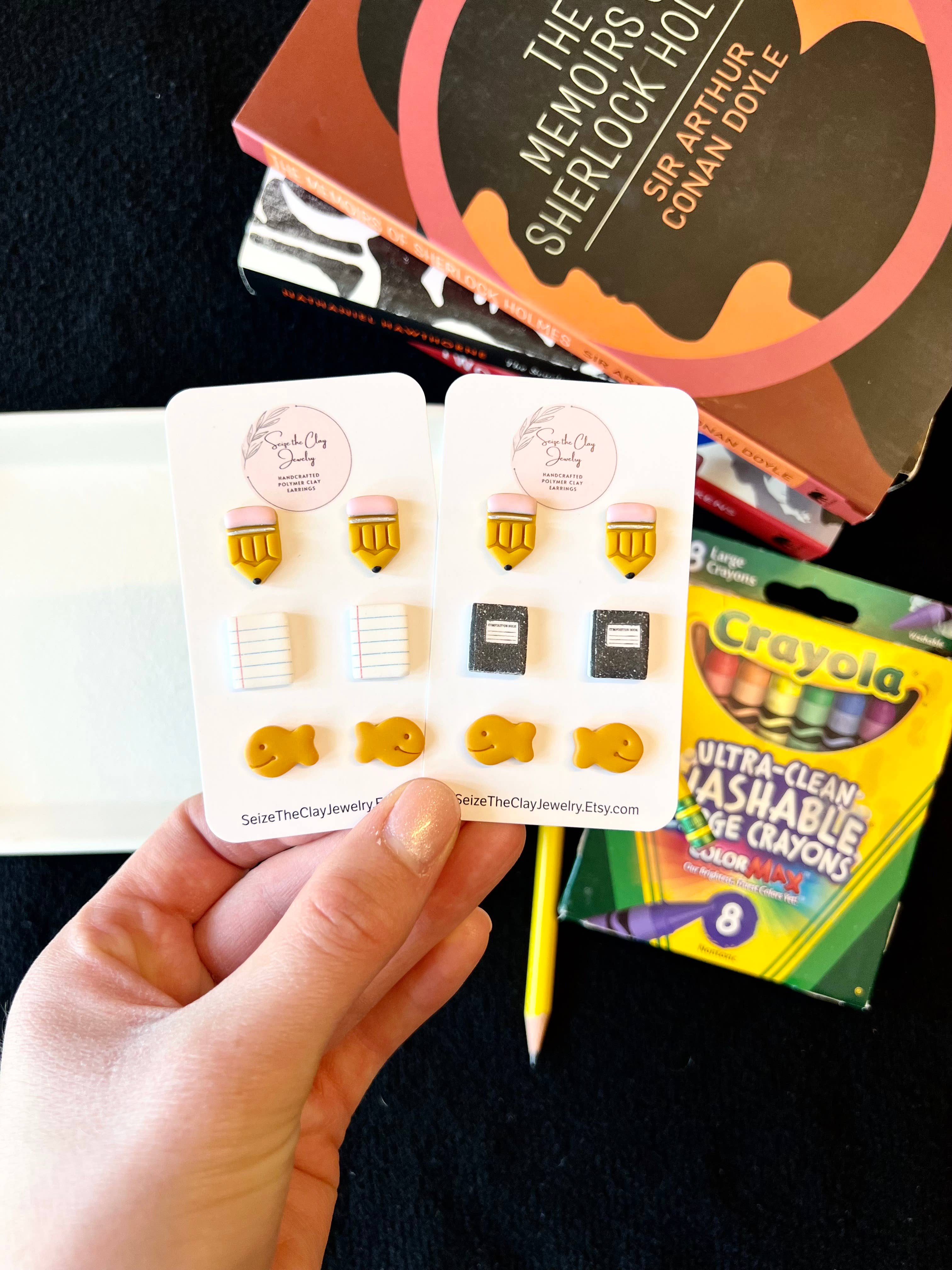 Ancora nessuna recensione per Borchie in argilla a matita, borchie in argilla a forma di pesce rosso, orecchini per insegnanti.