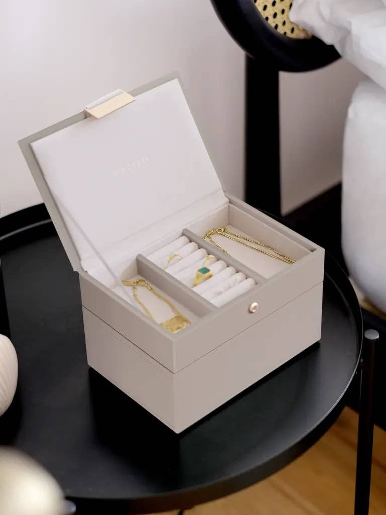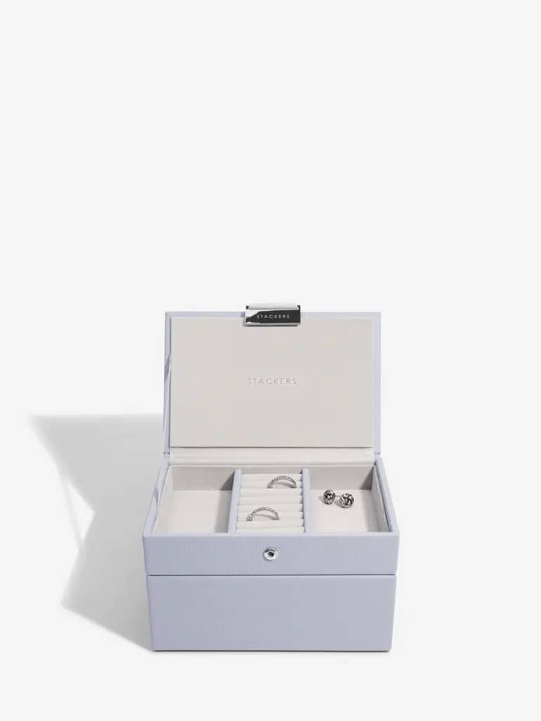 Mantieni i tuoi gioielli preferiti al sicuro e ben organizzati con versatili scomparti per anelli, orecchini, collane e bracciali. Il coperchio Mini Jewellery Box è il punto di partenza perfetto per il tuo portagioie Stackers o da usare come pezzo indipendente sulla tua cassettiera. Foderato con un lussuoso interno in velluto che protegge i gioielli in modo sicuro. Con esterno in pelle sintetica.