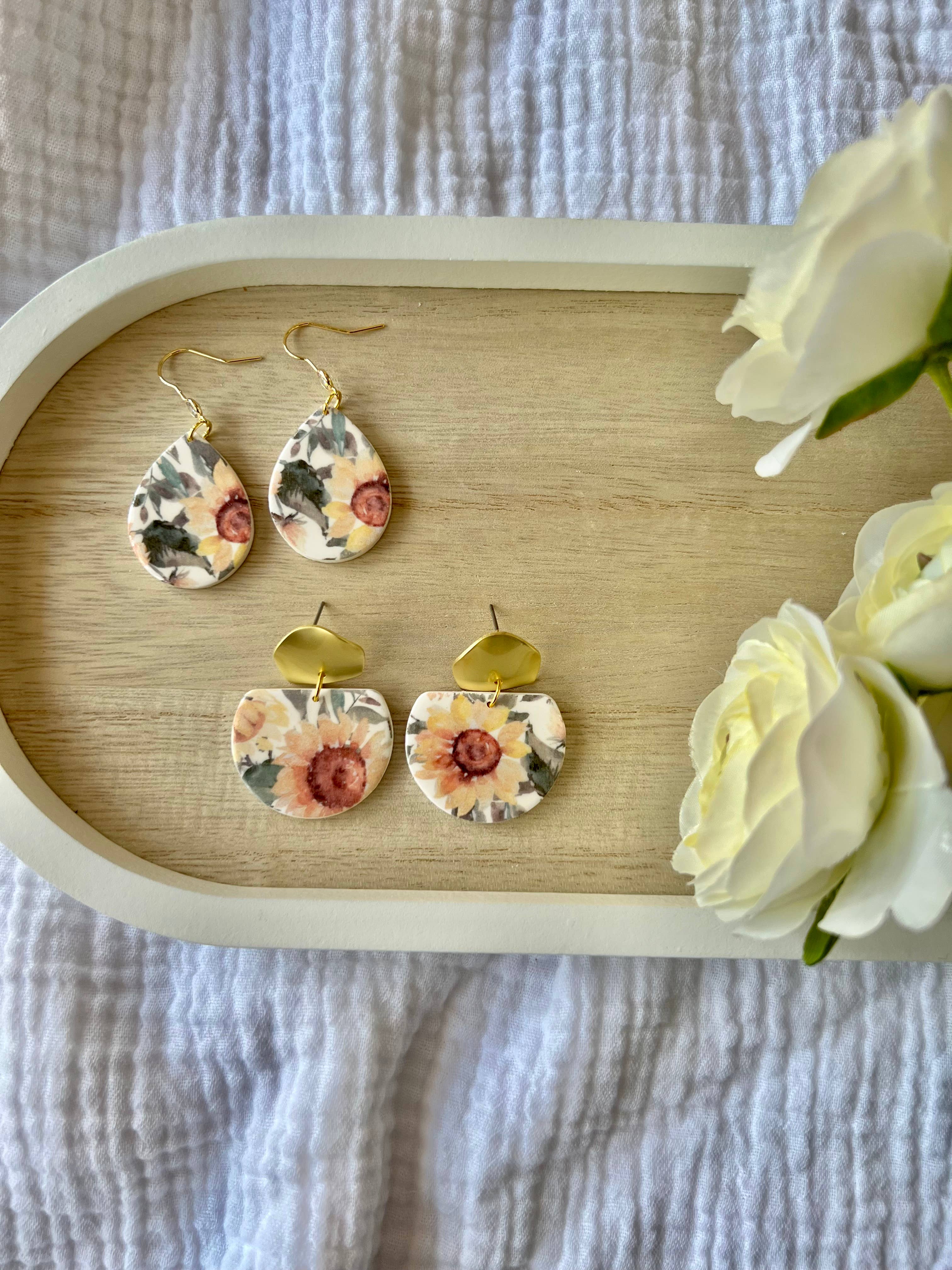 Realizzati in argilla polimerica, questi orecchini sono leggeri e comodi da indossare. Presentano perni rotondi placcati in oro, privi di piombo e nichel, e perni a pallina in acciaio inossidabile placcati in oro.