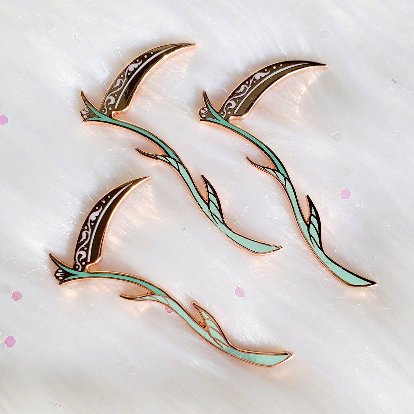 Per ordini di grandi quantità di 50 o più, dovrà essere un ordine speciale. Si prega di attendere fino a 6 settimane per la loro produzione e spedizione. Spilla in smalto placcato color oro rosa con disegno floreale Delft serigrafato Altezza: circa 2,75 pollici 2 chiusure in gomma sul retro Il perno è realizzato in lega di zinco, senza piombo e nichel Gli occhi brillano al buio