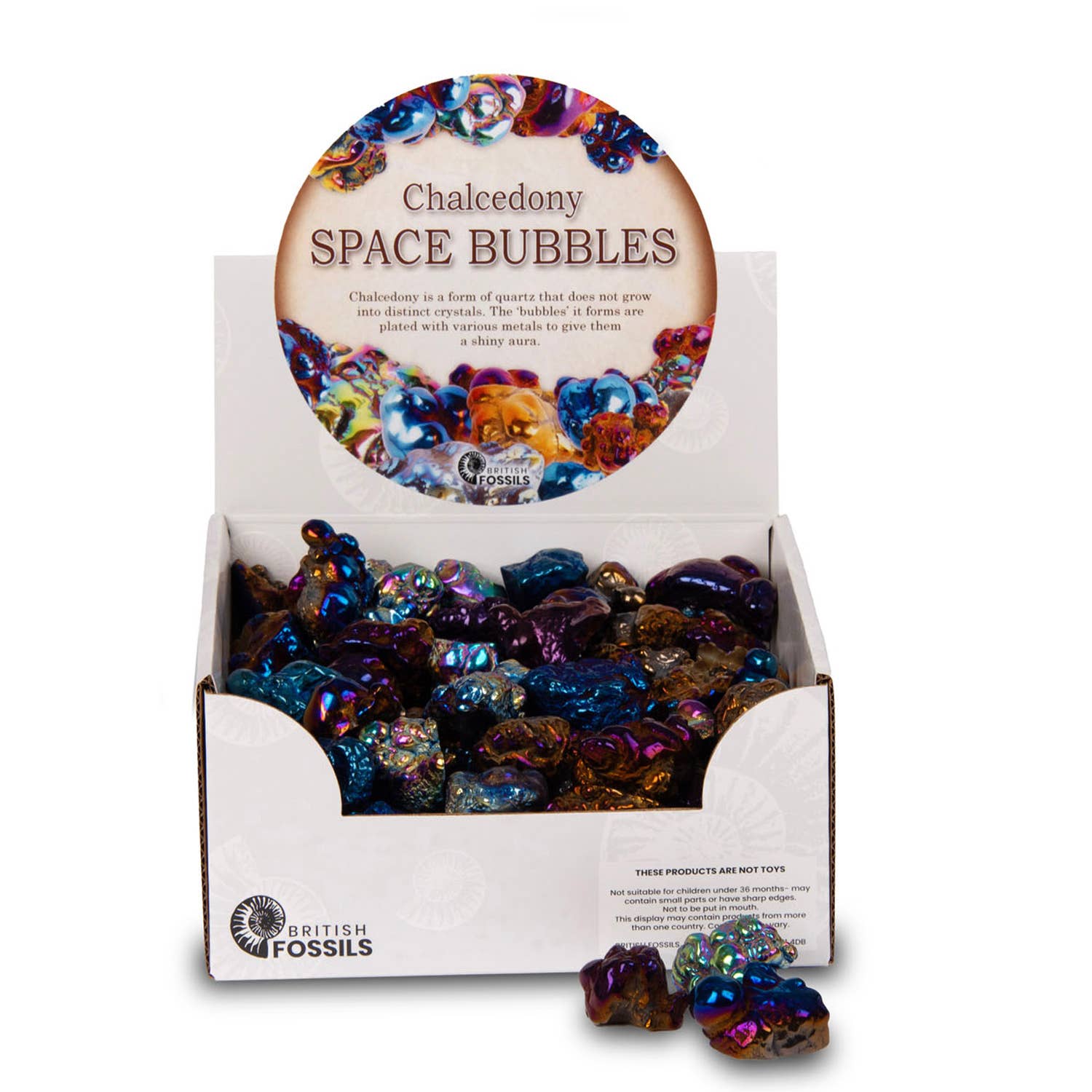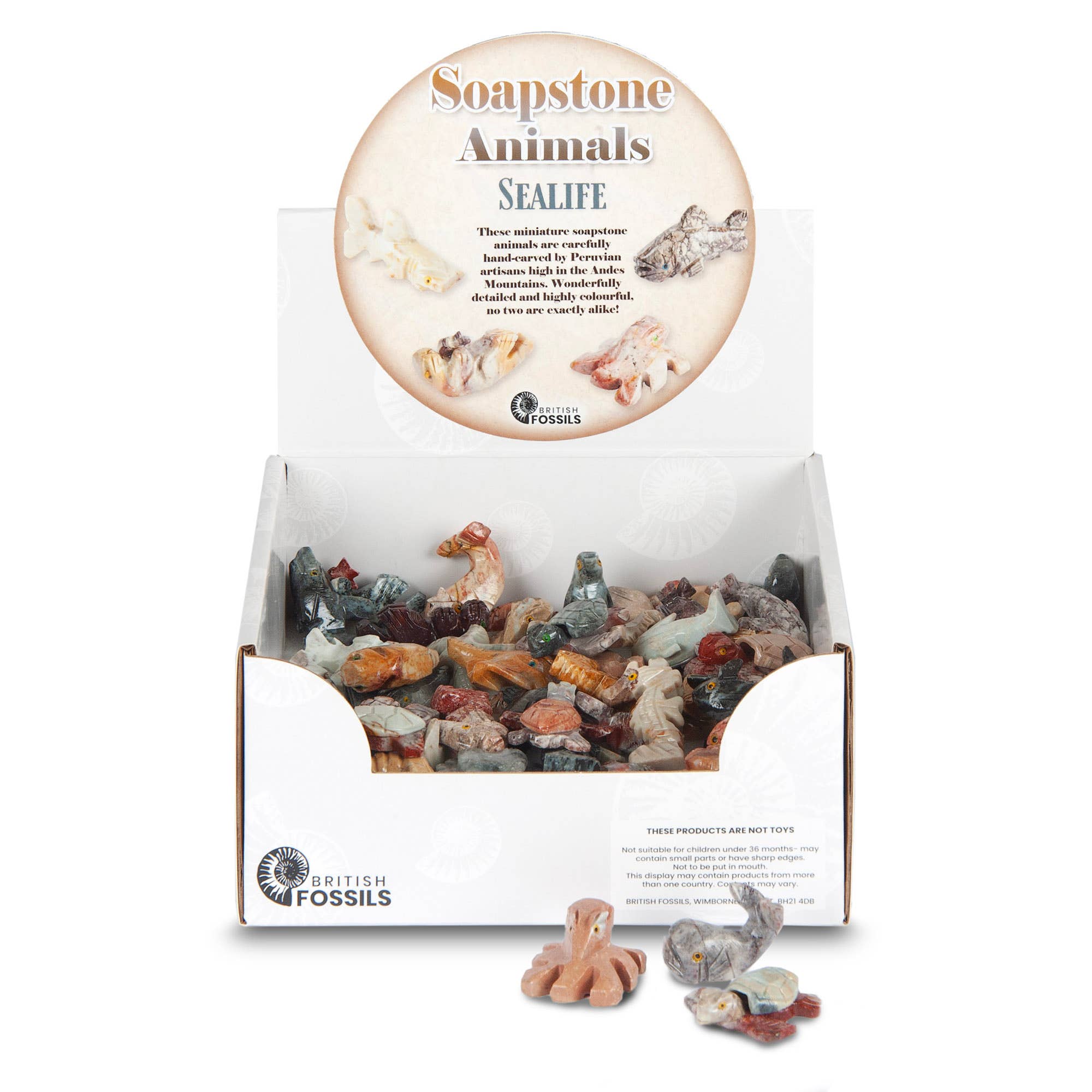 Questa confezione pronta per la vendita al dettaglio di ammoniti tagliate e lucidate, presentata nel suo espositore originale, contiene esemplari autentici di milioni di anni fa. Altamente collezionabile ed educativa, questa confezione è garantita per attrarre vendite! Dimensioni degli esemplari: 3-4 cm.