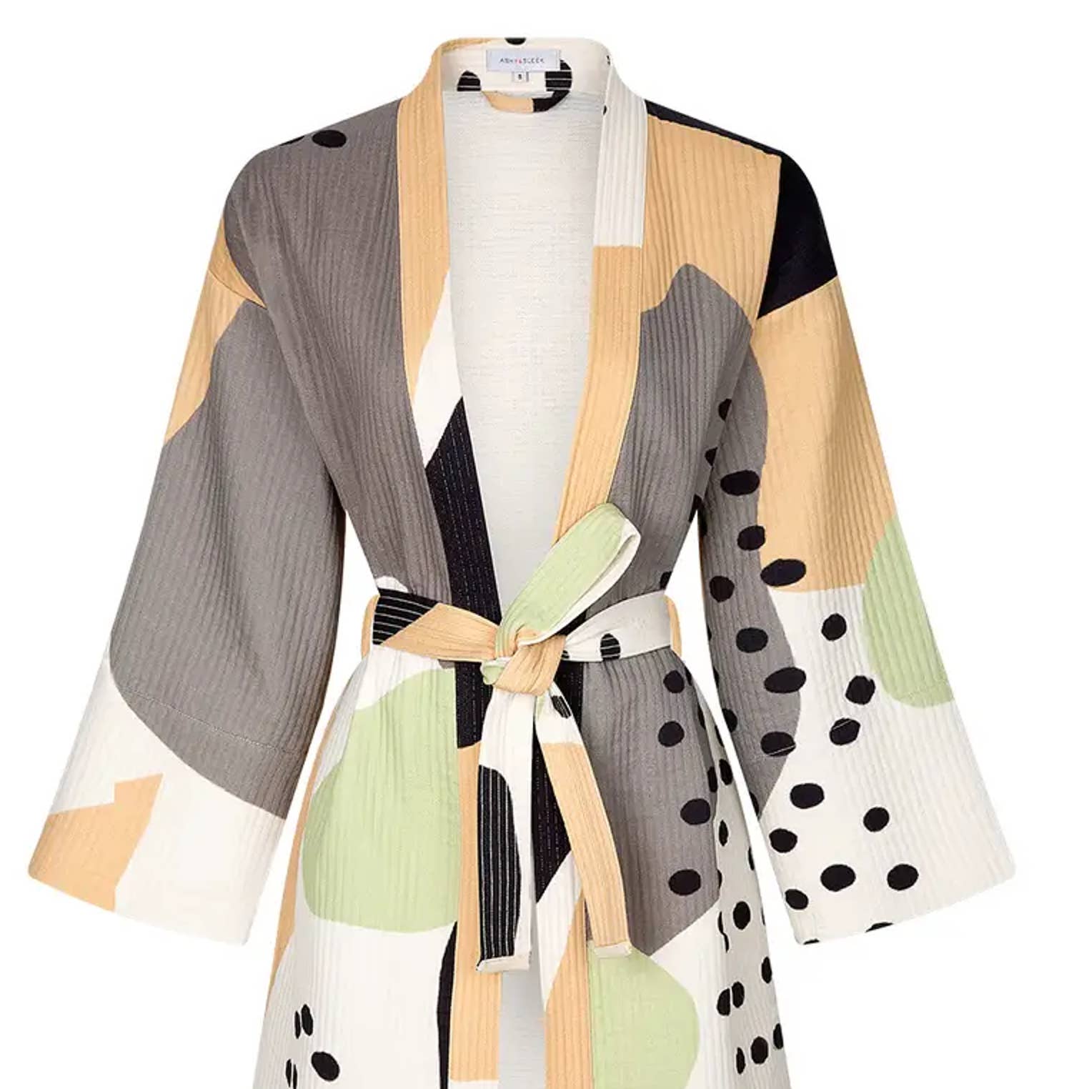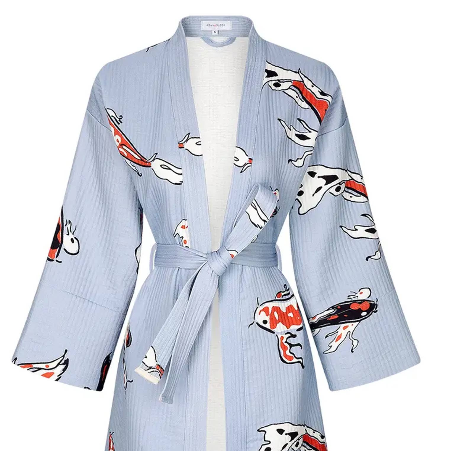 Disegnato e prodotto da e per ASHY & SLEEK, questo kimono unico presenta motivi di pesci Koi rossi, bianchi e neri su uno sfondo lilla. Realizzato in cotone 100%, unisex, disponibile in due taglie: S (adatta per taglie XS-S) e M (adatta per taglie M-L). Lunghezza al ginocchio e molto elegante. Può essere usato come kimono, vestaglia o accappatoio.