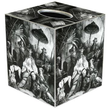 Le nostre copertine per fazzoletti da decoupage sono realizzate a mano su ordinazione dal nostro meraviglioso team a Houston, TX. Scivolano facilmente su qualsiasi copertura di scatola di fazzoletti a cubetti. L'opera d'arte è tagliata a mano, decoupata e lucidata. Ogni copertina di fazzoletti è dipinta a mano in oro o argento lungo i bordi come tocco finale. Offriamo 3 materiali per le copertine delle scatole di fazzoletti: 1. Cartapesta: $19 Dimensioni: 5,5» H x 5» L x 5» L 2. Legno: $30 Dimensioni: 5,25" H X 5" L X 5" L 3. Latta: $30 Dimensioni: 5,75» H x 5,125» L x 5,125» L