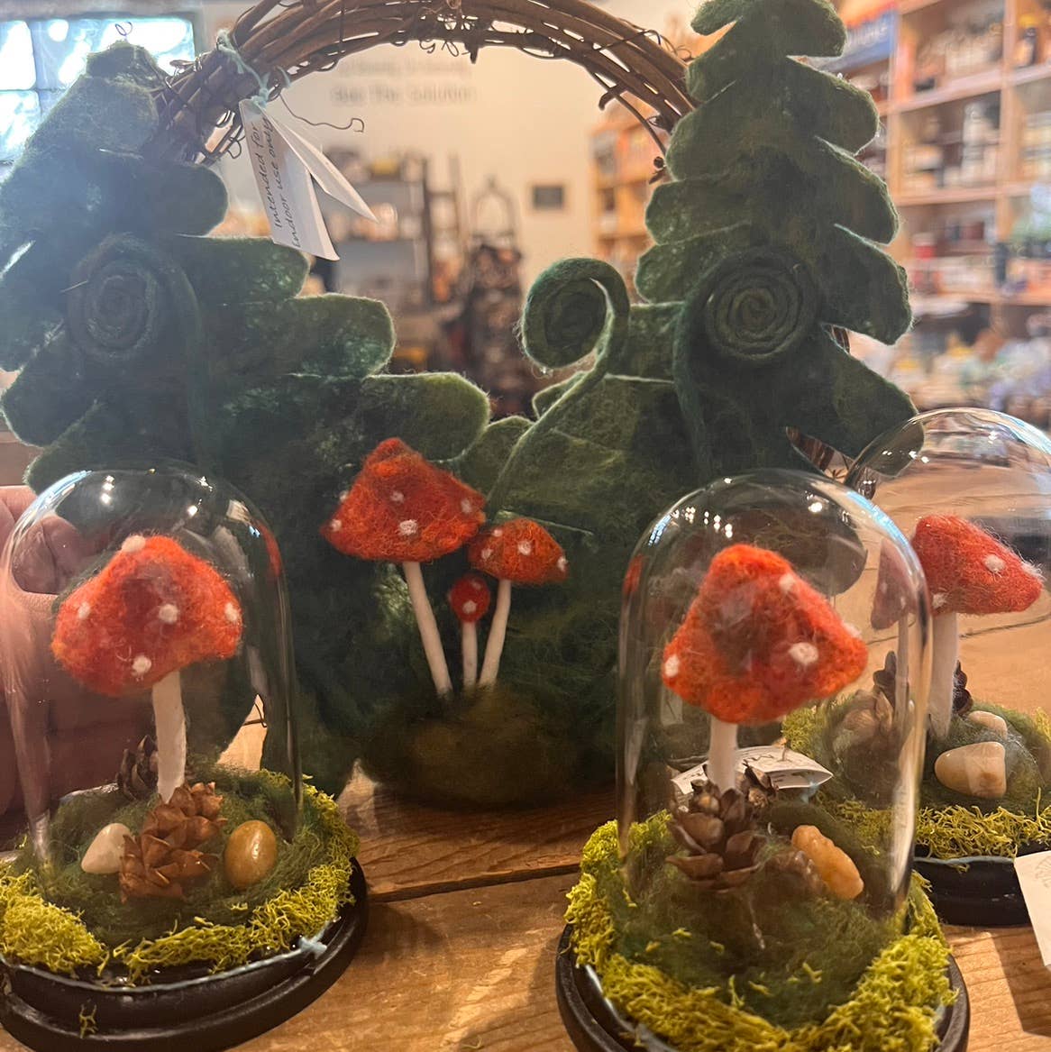 Non importa il tempo fuori dalla tua porta, è la tarda primavera tutto l'anno all'interno di questo piccolo mondo forestale. All'interno di questa piccola campana di vetro, troverete un minuscolo fungo della foresta infeltrito a mano che attraversa il lussureggiante pavimento della foresta ricoperto di muschio. Questo piccolo fungo della foresta è abbinato a muschio reale conservato, due mini pigne e ciottoli e sigillato all'interno di una campana di vetro soffiato a mano montata su una base espositiva in legno scuro dettagliata. Misura 1,85 «x 3,5" questo mondo segreto sarà l'aggiunta perfetta a qualsiasi punto, sia che si tratti del davanzale della finestra della cucina, della libreria o del tuo cubicolo al lavoro. Questa cloche per terrario, realizzata a mano con cura, è stata creata per i vagabondi, gli escursionisti e gli amanti della foresta in modo che possano sempre avere un pezzo di natura ovunque possano vagare. Ogni prodotto realizzato da MJ & Me è realizzato a mano con tanto amore e un po' di magia. Siamo orgogliosi di realizzare regali e decorazioni sostenibili ispirati alla natura.