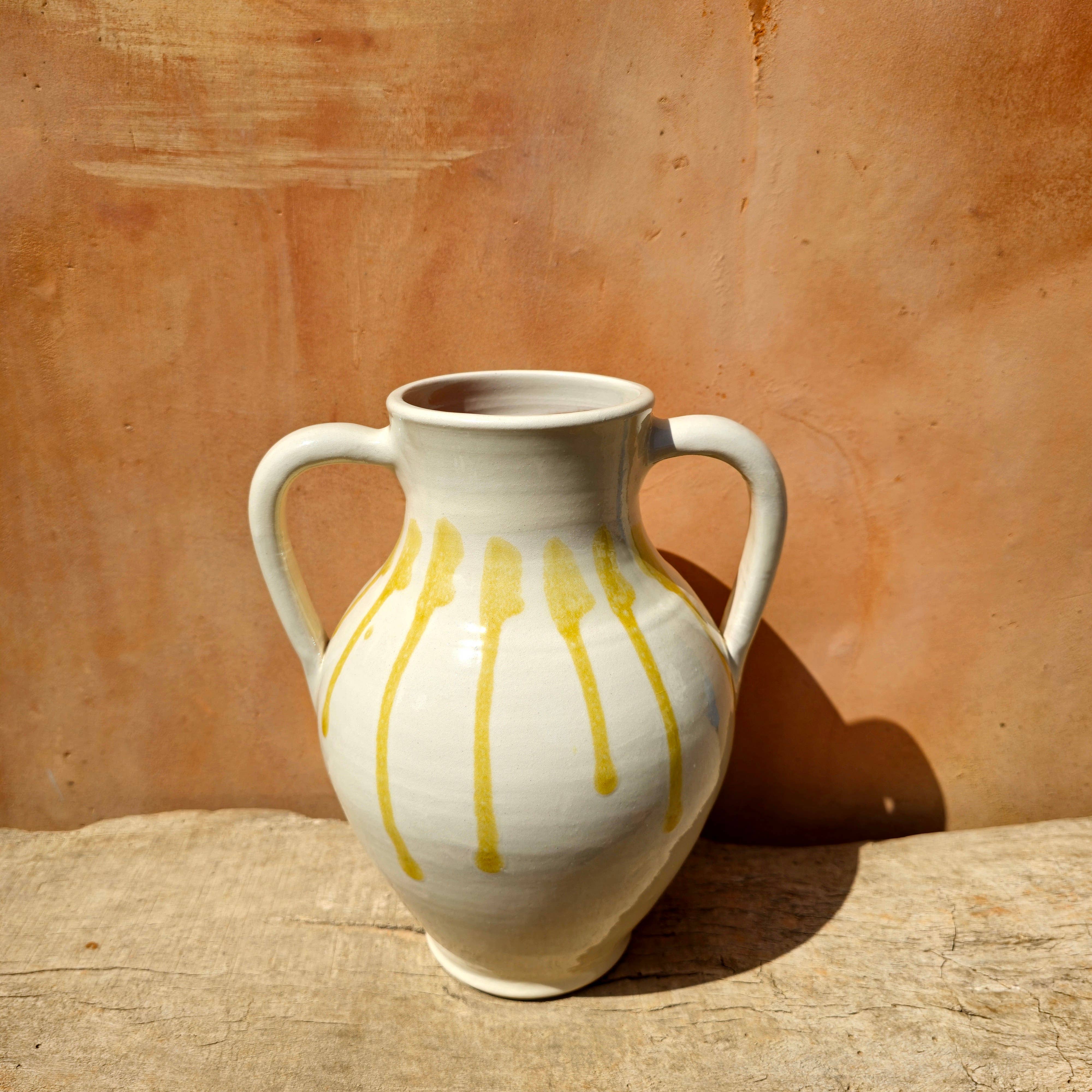 Bianco smaltato, con pennellate di giallo, tornito e rifinito a mano. Le tonalità di colore variano leggermente poiché ogni pezzo viene immerso a mano. Come si faceva originariamente. Questo rende ogni pezzo unico. Utilizziamo materie prime ecologiche e sostenibili, con le quali assicuriamo la cura dell'ambiente. Le spedizioni vengono effettuate con cartone riutilizzato, proveniente da un'altra attività locale. Misure S: 9X9X10H cm M: 10X10X15H cm L: 11X11X20H cm Peso: S: 200g M: 275g L: 475g