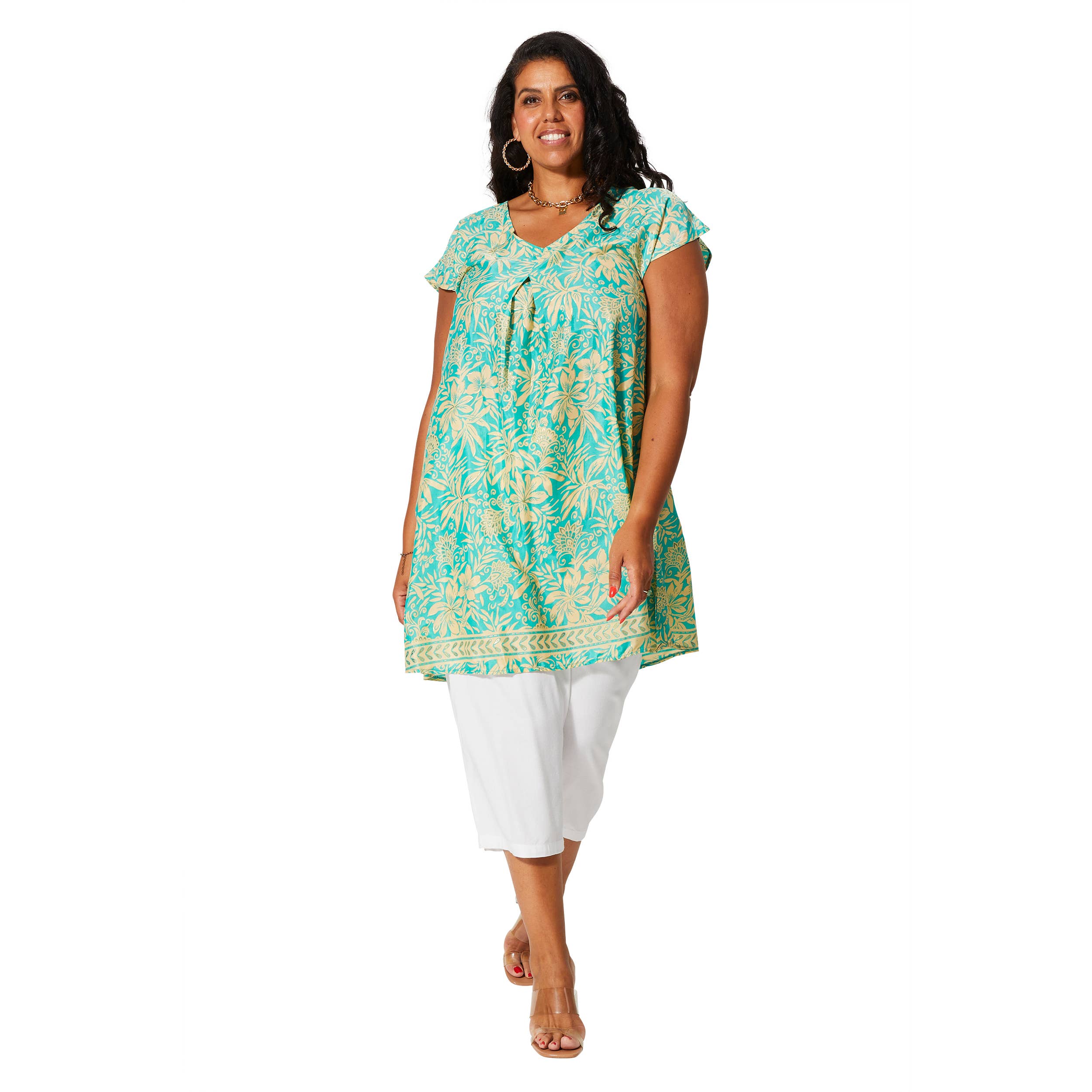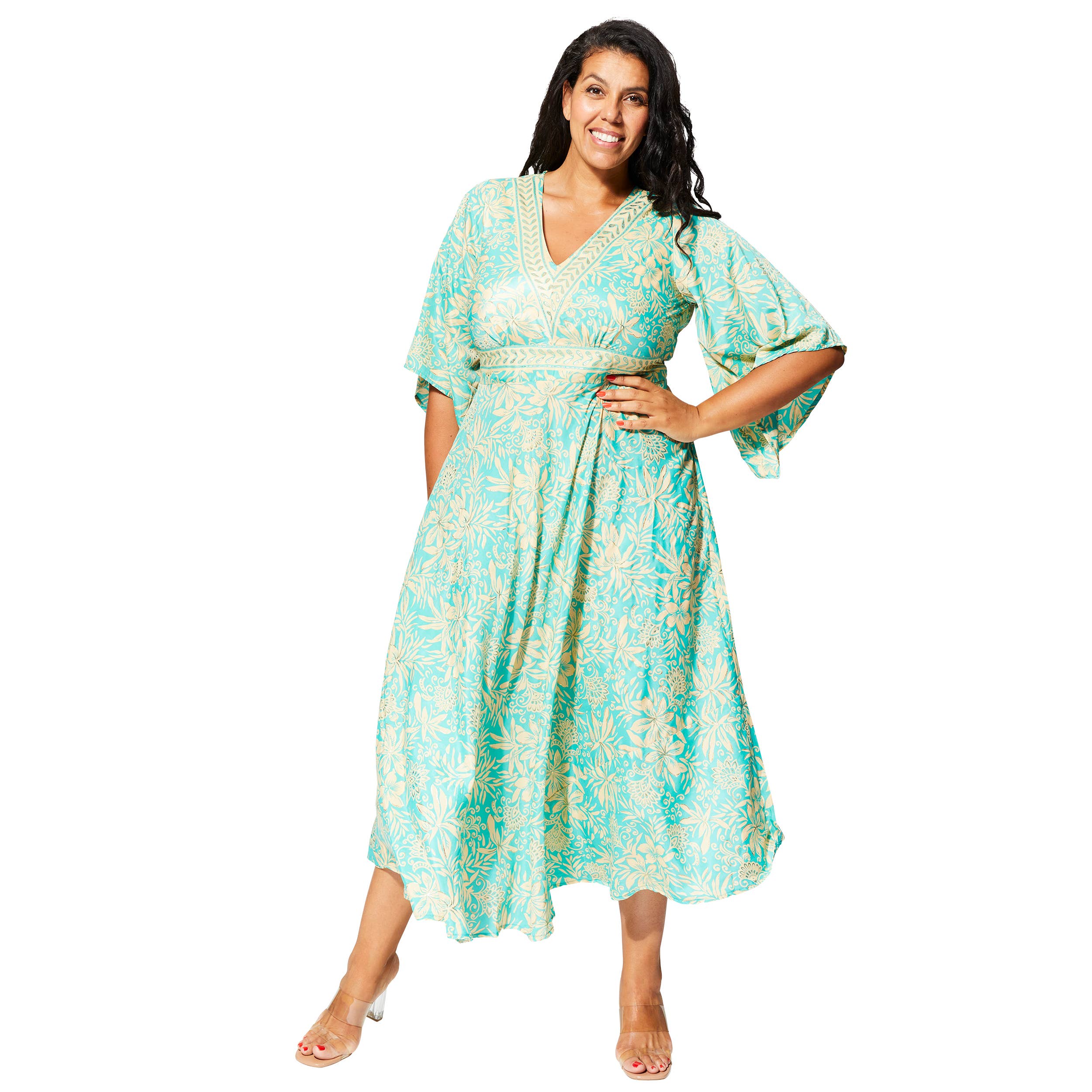 Abito lungo estivo con maniche corte ampie. Materiale: 100% poliestere. Struttura: tessuto intrecciato. Lavaggio: lavatrice a 30°C. Colori disponibili: turchese, rosso, arancione. Collo: scollo a V frontale e posteriore con coulisse. Chiusura: schiena arricciata con lacci da annodare. Corrispondenza taglie FR: XL - 1X - 2X - 3X (44/46 - 48/50 - 52/54 - 56/60).