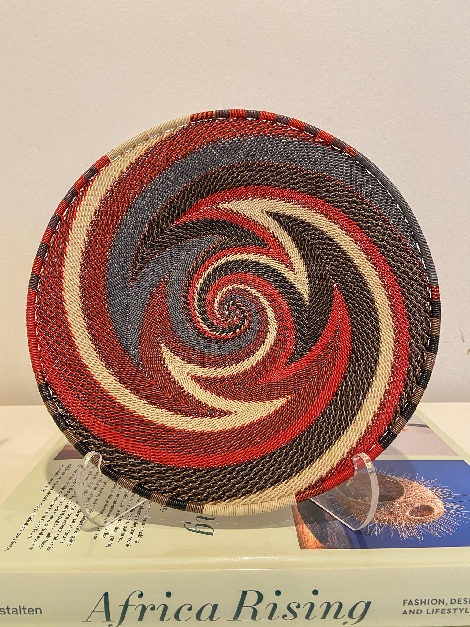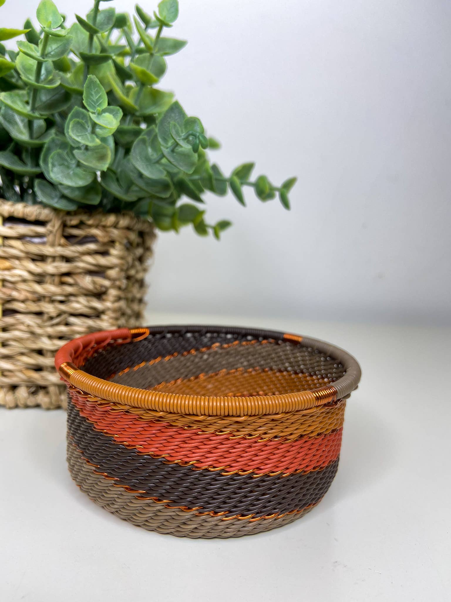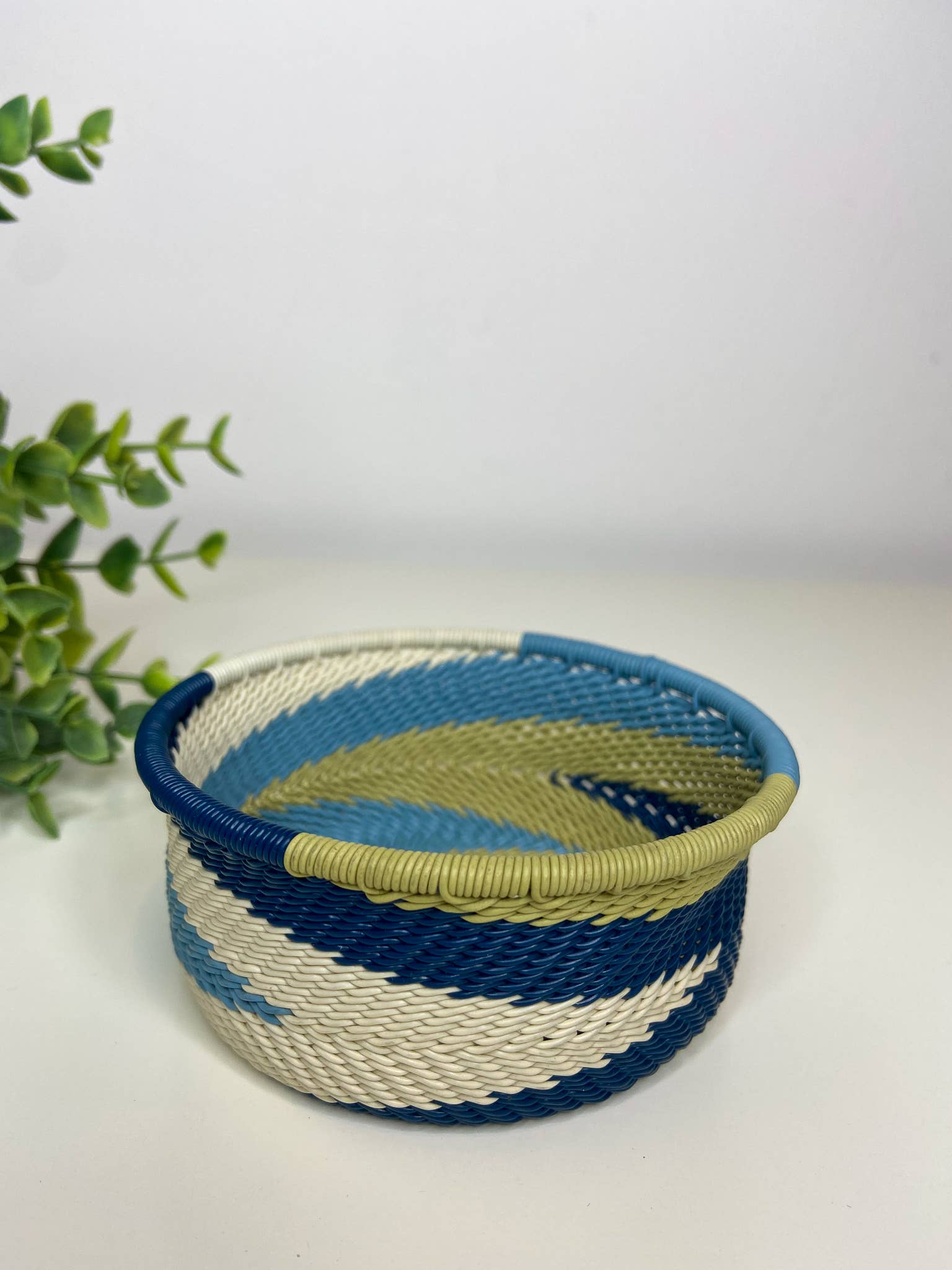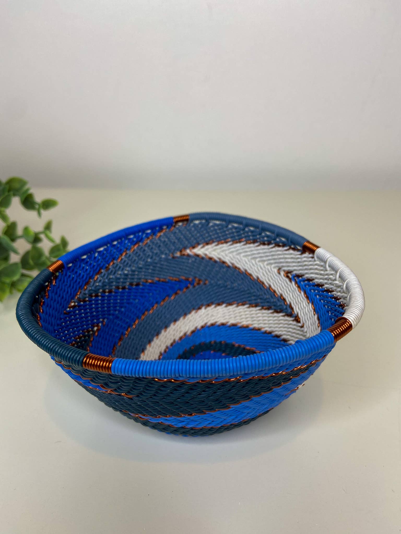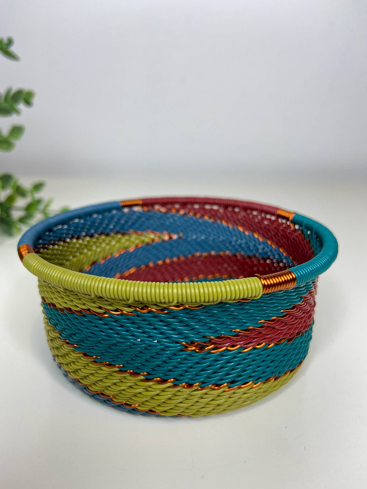 Questa ciotola decorativa è intrecciata a mano con filo telefonico. Si tratta di un tradizionale lavoro zulu ed è costituito da bobine di filo telefonico avvolto attorno ad un solido nucleo metallico, per definirne la forma. Ha un tocco moderno alla sua marca con l'infusione di motivi di colori vivaci. La complessità del design rende questa ciotola così preziosa grazie alle lunghe giornate di produzione coinvolte nel suo design. Non ci sono due pezzi uguali. I disegni possono variare, rendendo ogni singolo pezzo molto più unico. Perfetto in ufficio, come accessorio da scrivania o da comodino per gioielli. Multiuso Prendi tutto per gli accessori. Realizzato con bobine di filo telefonico avvolto intorno a un solido nucleo di metallo. Colorato. Twist moderno alla tessitura tradizionale. Design intricato grazie ai lunghi giorni di produzione. Lavare delicatamente con acqua tiepida e sapone. Diametro: 10 cm. Altezza: 4 cm.
