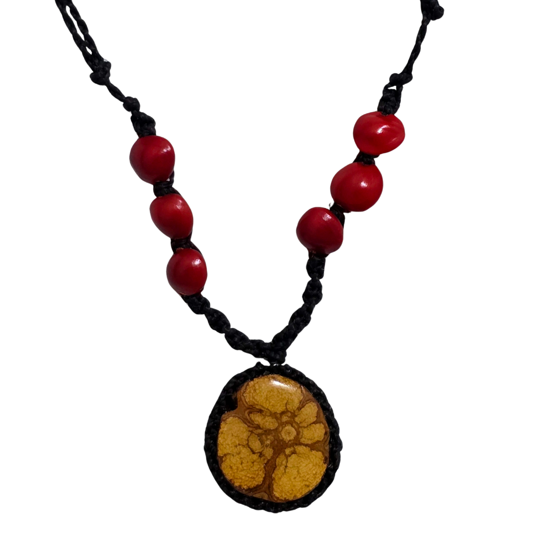 Questa elegante collana in stile boho presenta un elemento centrale in sodalite, una sezione trasversale laccata della vite di ayahuasca e varie piccole perline di pietra incastonate in un elaborato design in macramè con filo cerato. L'ayahuasca è utilizzata da molti sciamani amazzonici in cerimonie tradizionali. Ogni collana ha un filo cerato con due nodi che permettono di regolare facilmente la lunghezza per adattarla alla testa e poi stringerla. Le collane sono state realizzate da esperti artigiani di Iquitos. Si prega di ricordare che ogni pezzo di pietra è unico, quindi il motivo varierà rispetto a quello mostrato nella foto principale di questo prodotto. Modello: NK152P32