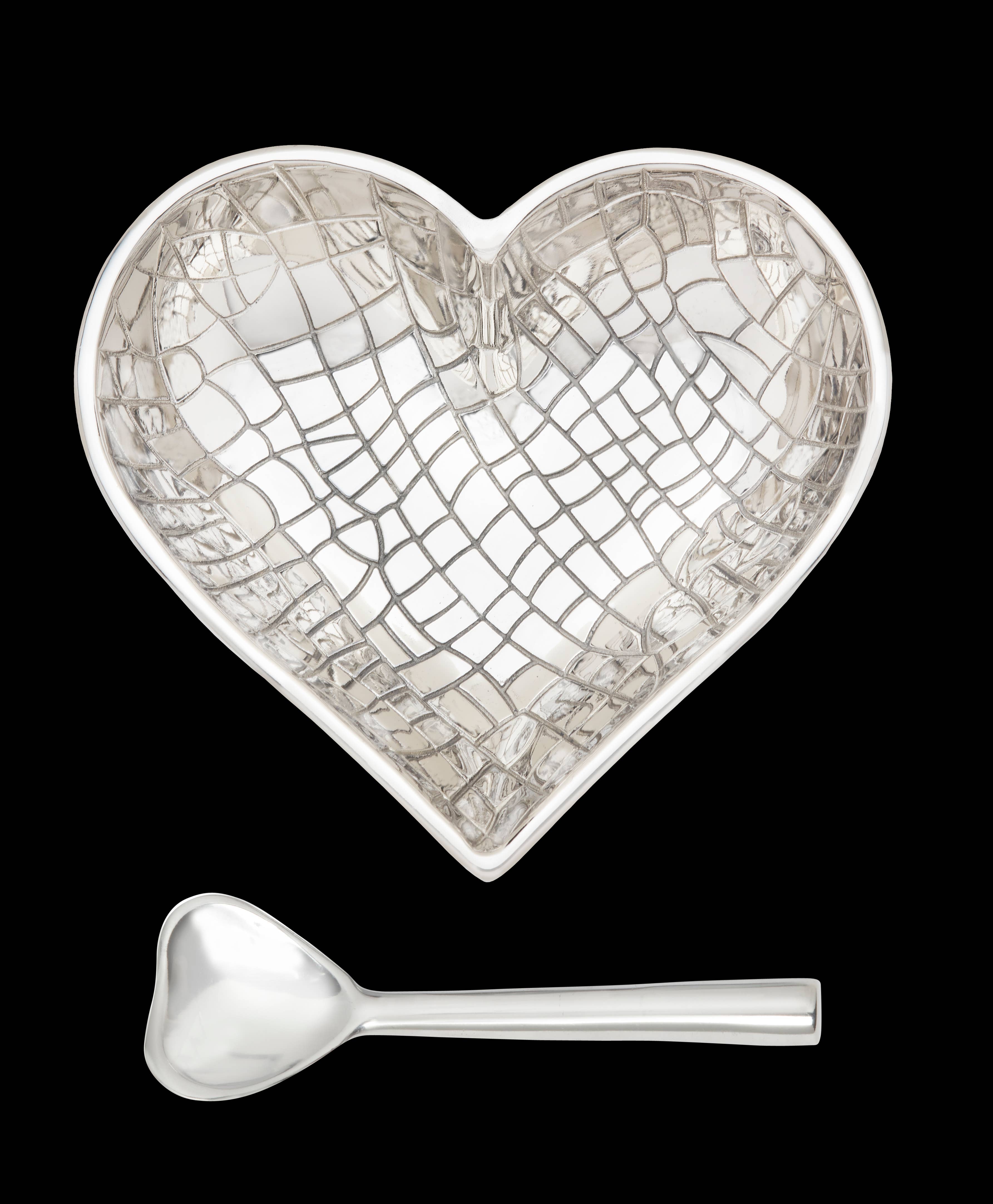 I Cuori Felici rendono facile mostrare a qualcuno il tuo amore! Sono disponibili nei colori e nei motivi preferiti di tutti! Riempili con caramelle deliziose, noci, cracker, patatine e salse... o usali come raccoglitori colorati per gioielli e altri piccoli oggetti. Un cucchiaio a forma di cuore dorato lucido accompagna ogni piatto. I Cuori Felici si incastrano perfettamente con i nostri Cuoricini da 4" per raddoppiare l'amore! Realizzati a mano in alluminio lucidato adatto agli alimenti. Dimensioni: 5,25"; Cucchiaio-4" Un'ottima idea per un regalo di San Valentino!
