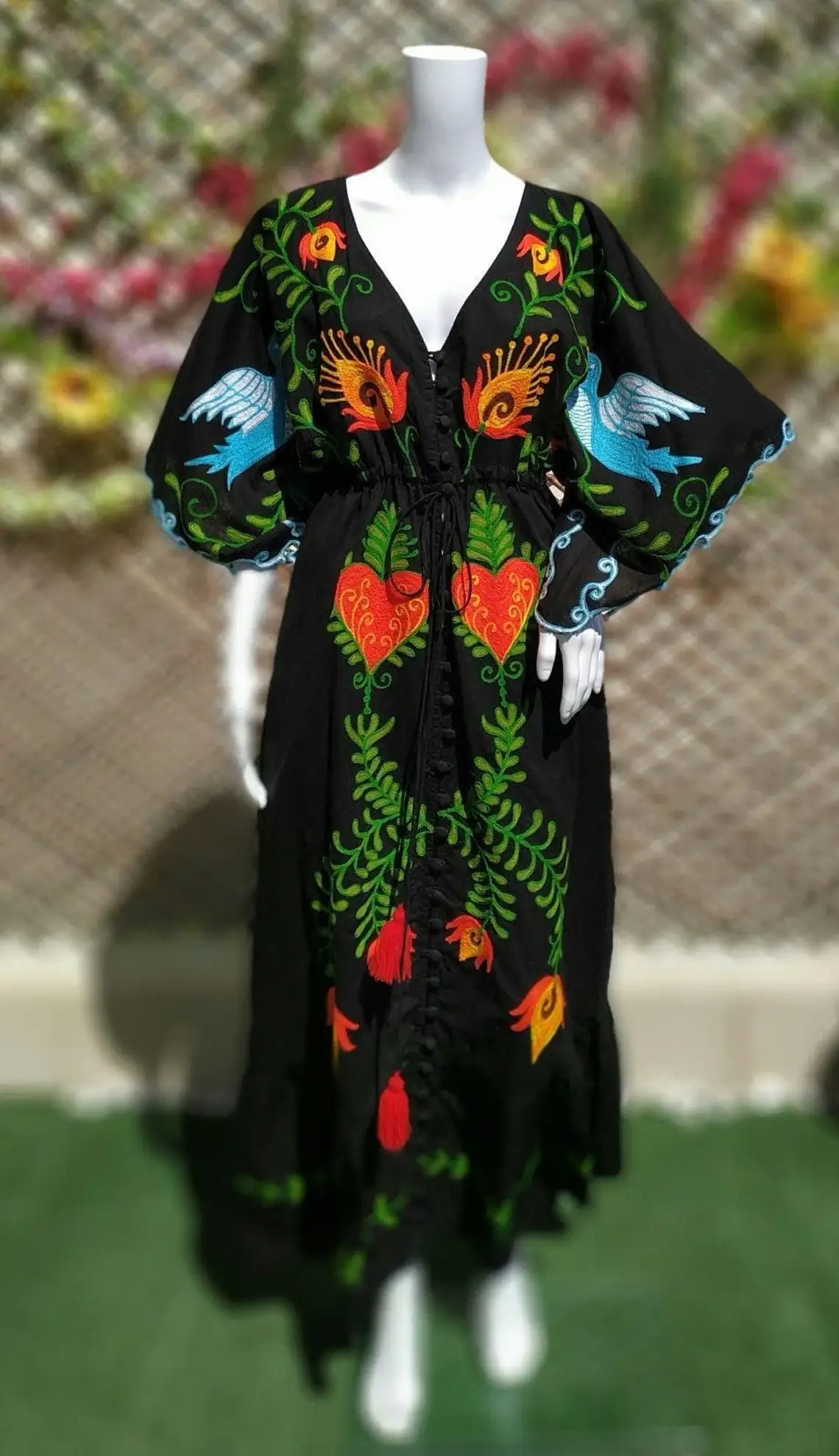 Vestito in stile boho, realizzato in 100% cotone, con ricami messicani fatti a mano dal motivo floreale. Scollo a V profondo e maniche lunghe svasate. Disponibile in magazzino con spedizione immediata.