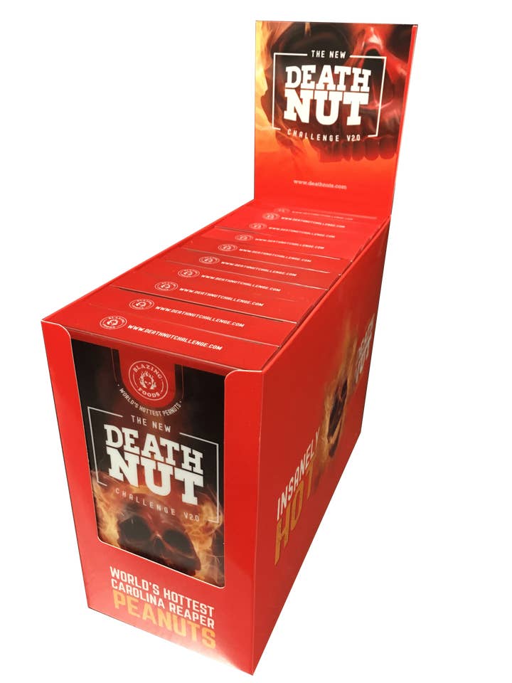 FINALMENTE... un remake e miglioramento della bestia originale! Abbiamo iniziato con deliziosi corn nuts croccanti e tostati e poi abbiamo fatto ciò che sappiamo fare meglio: rendere il tutto piccante! Abbiamo sviluppato un nuovo mix di spezie Chile-Lime e una selezione delle peperoncini più piccanti al mondo per un perfetto equilibrio di sapore intenso e calore bruciante. Non ci sono cristalli puri di capsaicina questa volta, ma abbiamo inventato un processo top-secret a doppio rivestimento per garantire un carico serio di piccantezza in ogni singolo corn nut dentro il tubo. Estremamente piccante!