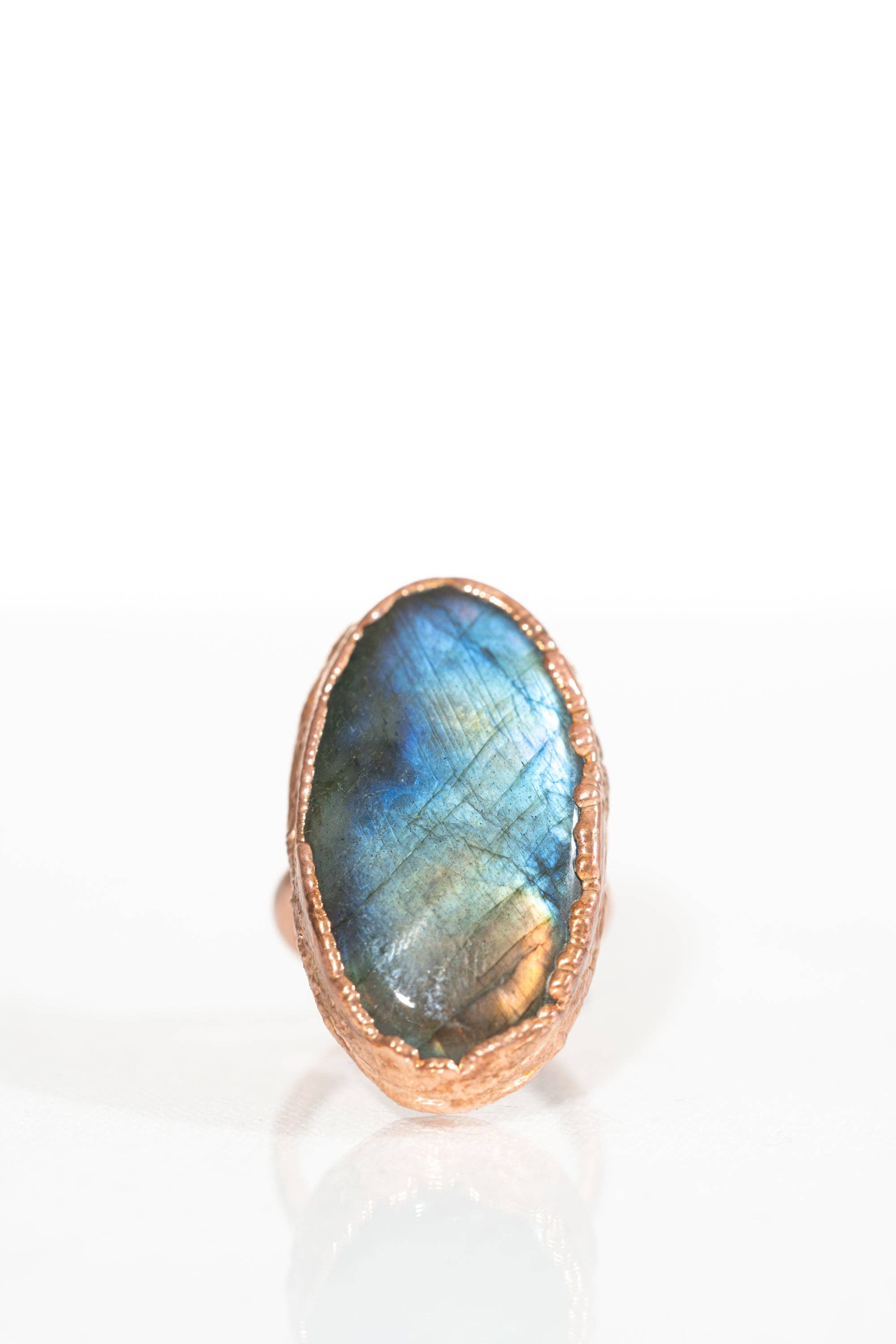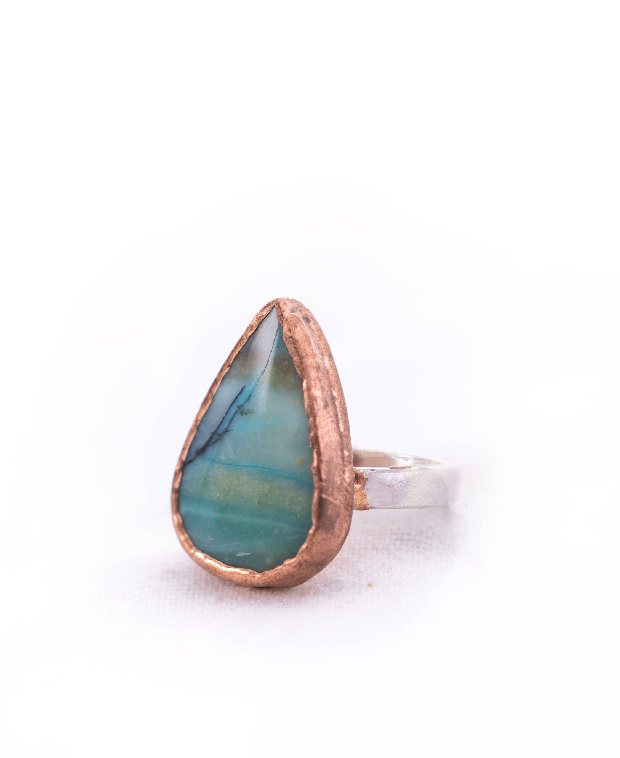 Anello in Vetro di Mare Verde Acqua Questo pezzo di autentico vetro di mare ha molta bella texture derivante dall'essere stato sballottato nella sabbia per decenni. È stato montato su una piastra posteriore in argento sterling per permettere alla luce di riflettersi, ed è incrostato di rame puro. Questo anello in vetro di mare verde acqua è una taglia 5 1/2 ma potrebbe essere allungato fino a una 6 o 6 1/2 se necessario, aggiungendo texture alla fascia.