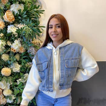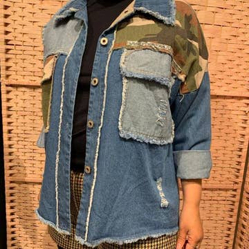 Giacca in denim lavato con bottoni, tasche e maniche a contrasto con paillettes Dettagli Materiale interno: 91% cotone 9% poliestere Contrasto: 95% poliestere 5% elastan Fodera: 100% poliestere Taglia e vestibilità - La modella è alta 12,7 cm e indossa la taglia S - Misure prese da Size Small - Lunghezza approssimativa: 23,5"