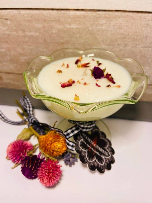 Vasetti in vetro vintage da circa 8-10 once ciascuno. Candele al 100% di cera di soia infuse con fiori secchi coltivati localmente. **NOTA: La nave in foto è quella di dare un esempio di taglia. Tutte le navi sono uniche e soprattutto uniche nel suo genere.