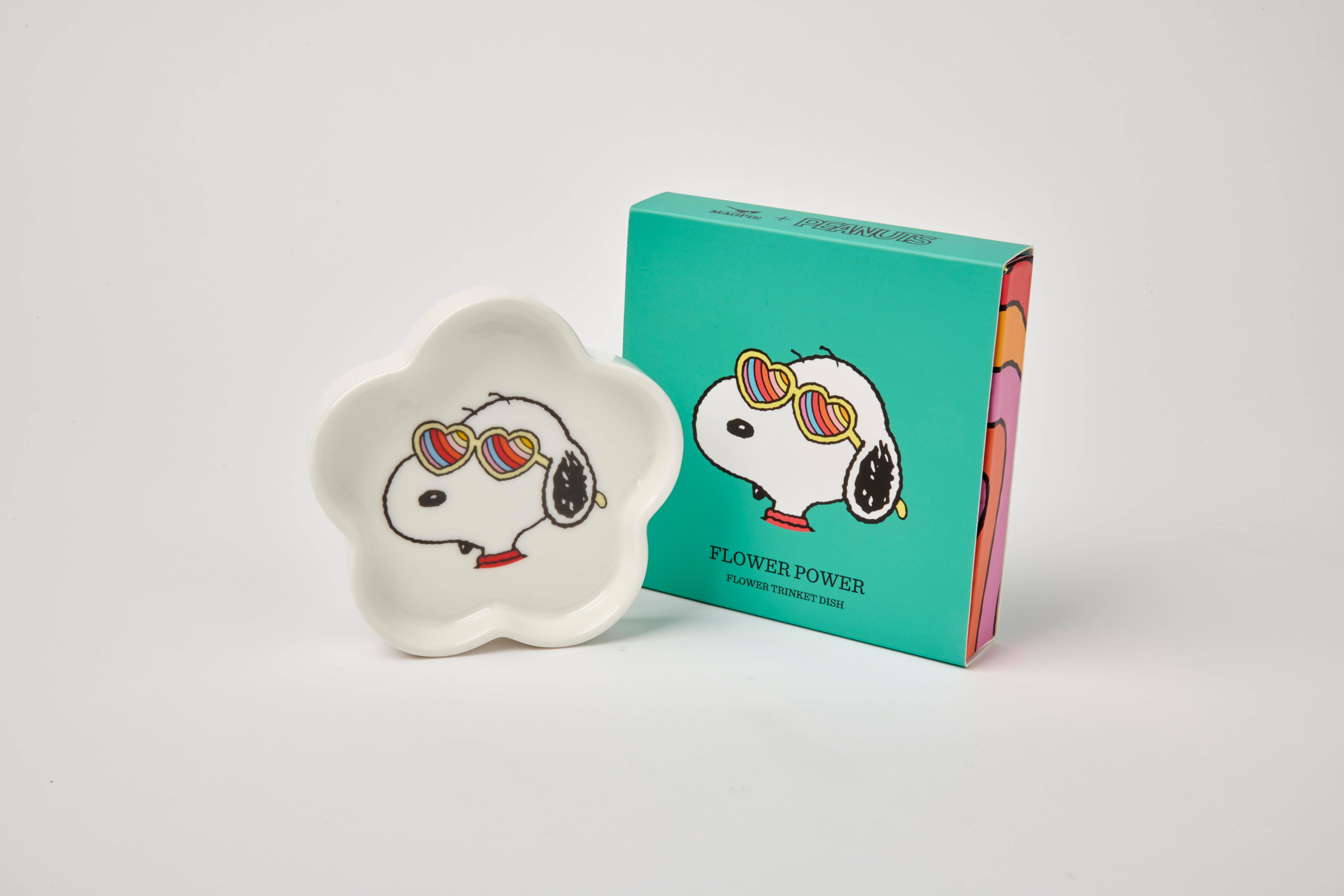 Carinissimo piattino/vassoio in ceramica vegana a forma di cuore da 10 cm. Decorato con Snoopy circondato da cuori. Con scatola regalo colorata a scorrimento.