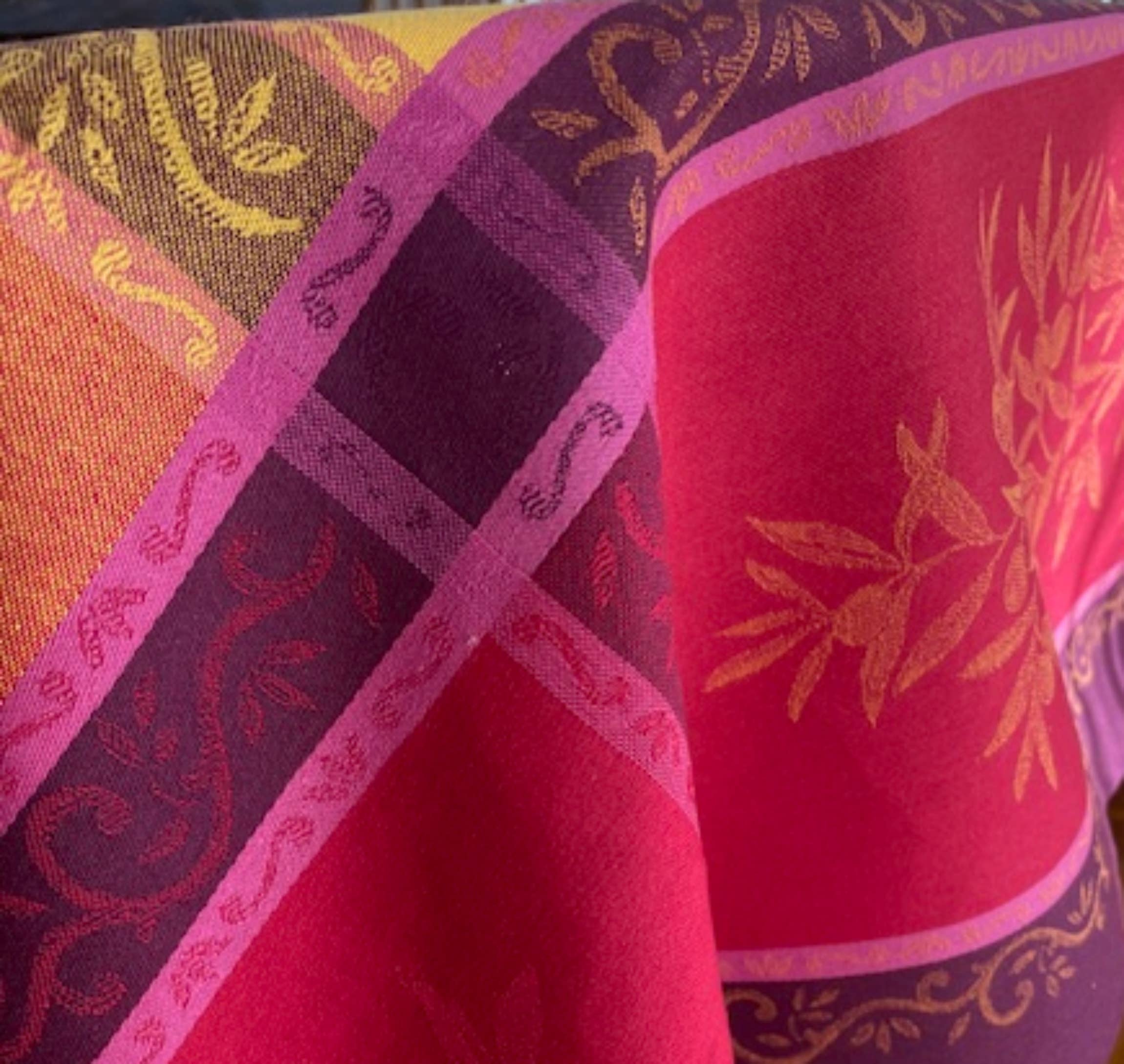 Realizzata in Francia, si tratta di una tovaglia jacquard in teflon 100% cotone. Il teflon intrecciato nel tessuto non consente alle macchie di penetrare nel tessuto pur rimanendo fedele alla sensazione naturale del cotone. Questa tovaglia è disponibile in un formato quadrato da 65 x 65 pollici e in un rettangolo da 65 x 100 pollici. Lavare in lavatrice in acqua fredda, asciugare all'aria o asciugare con un ciclo delicato a freddo.