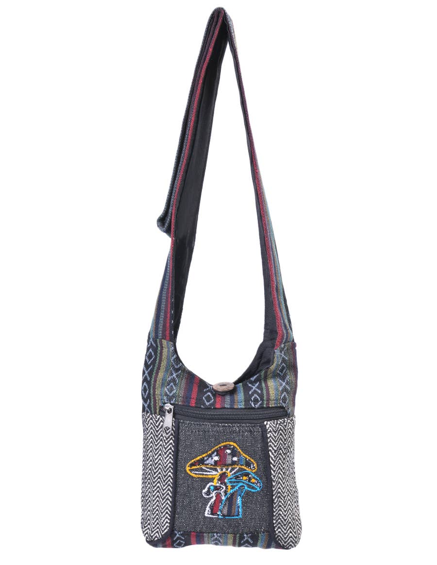 Mini borsa hobo tribale ricamata con funghi e pace