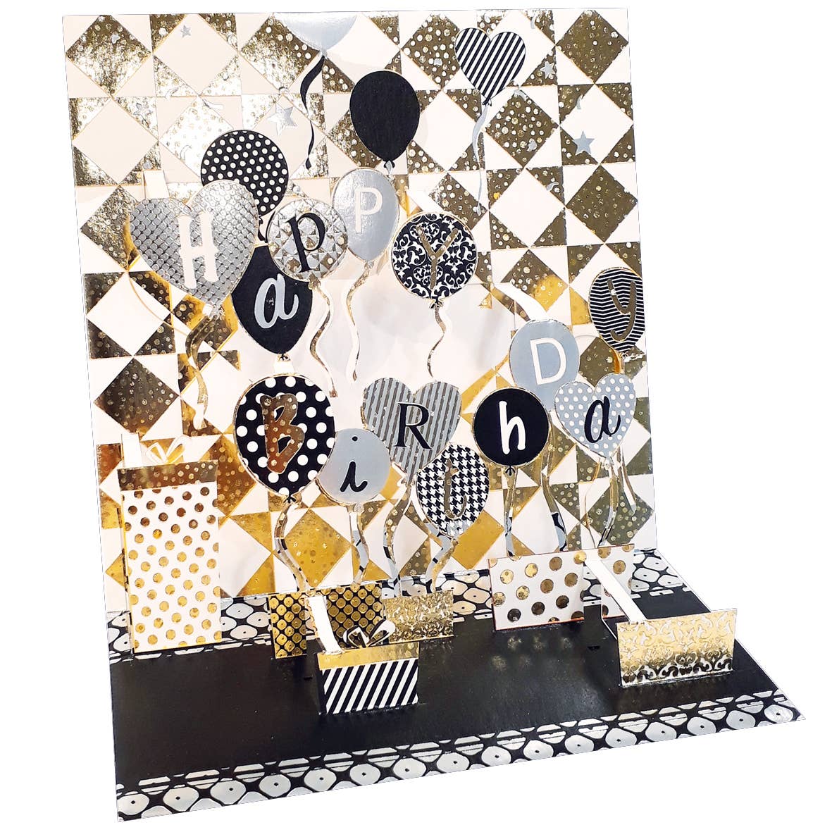 Cartolina pop-up con palloncini, motivo: buon compleanno Queste carte hanno un bell'aspetto sia chiuse che aperte. Una volta aperto, il disegno «si apre» per rivelare un'opera d'arte splendidamente realizzata rifinita con lamina, glitter o goffratura. L'aggiunta perfetta a qualsiasi regalo! Descrizione: Dimensioni: 6,3" x 6,3" (piegato) Biglietti pop-up con busta avvolti in cellophane Interno vuoto per lasciare spazio al tuo messaggio Ogni biglietto può stare in piedi da solo una volta aperto grazie alla sua intelligente struttura dal design triplice. Testo esterno: Buon compleanno Rifiniture: fustellatura laser, lamina, glitter Progettato in Francia