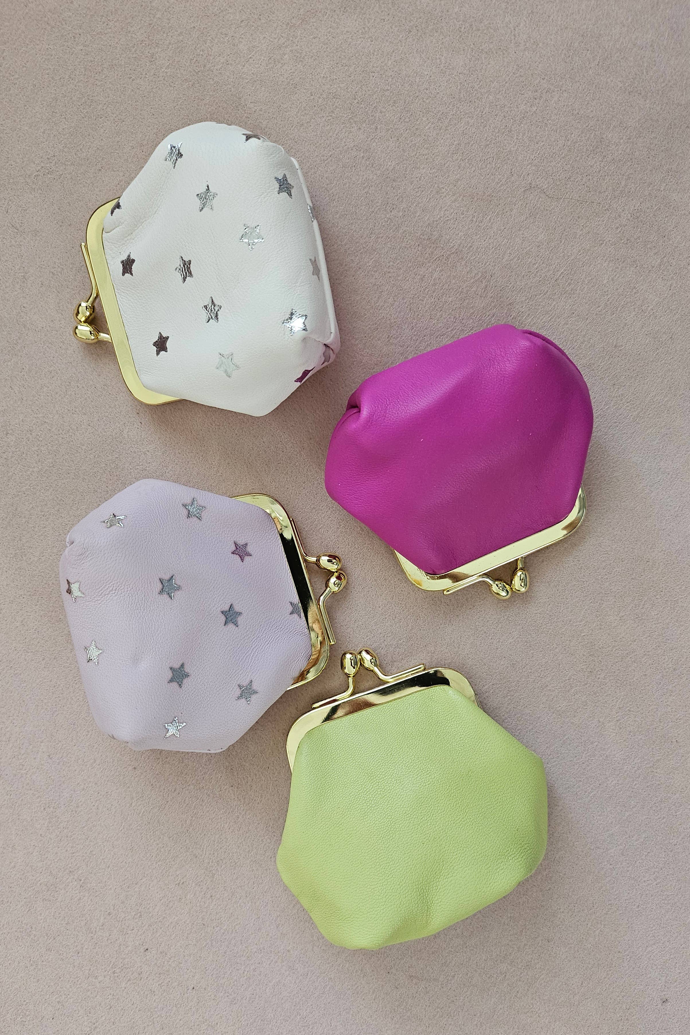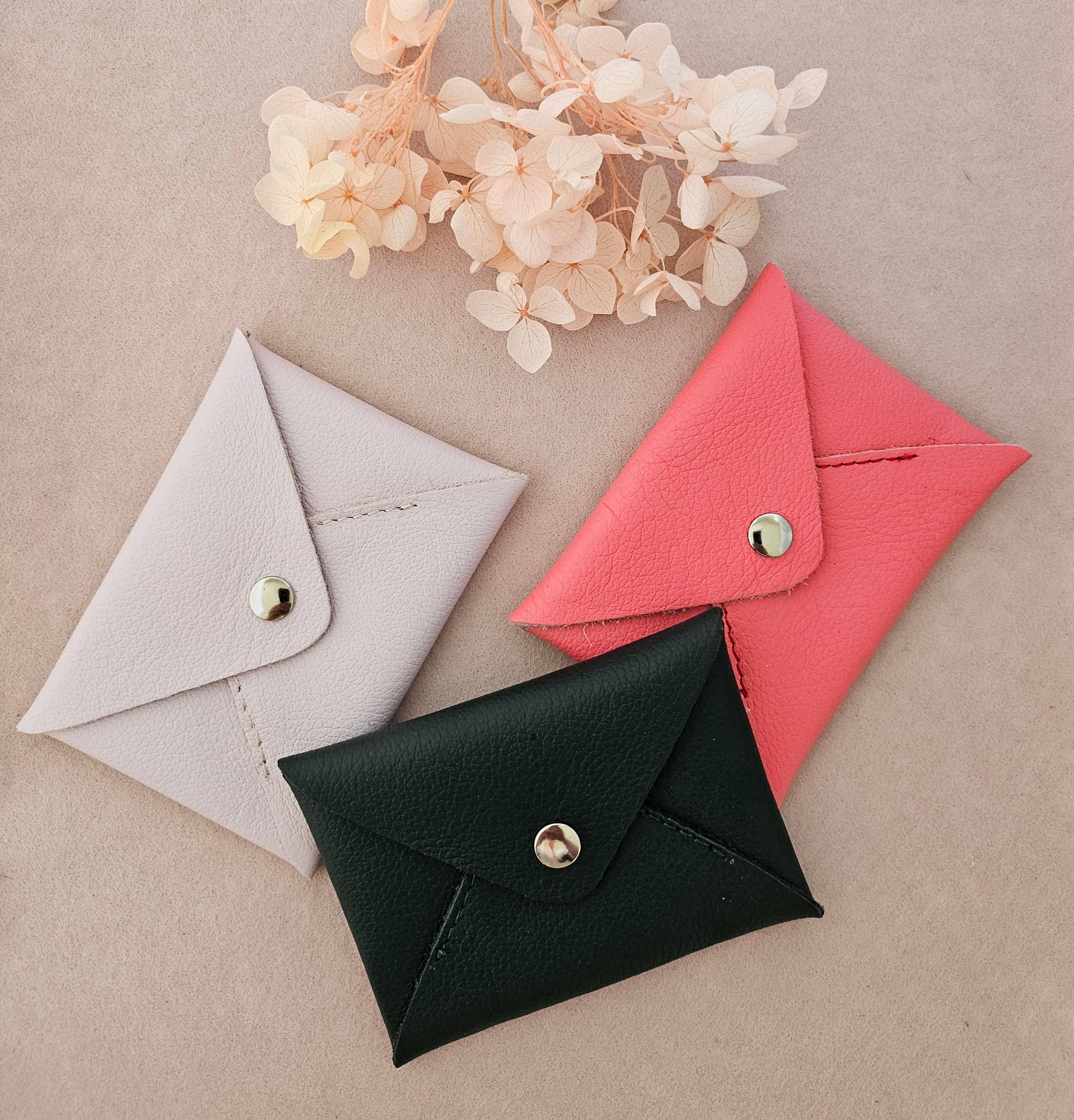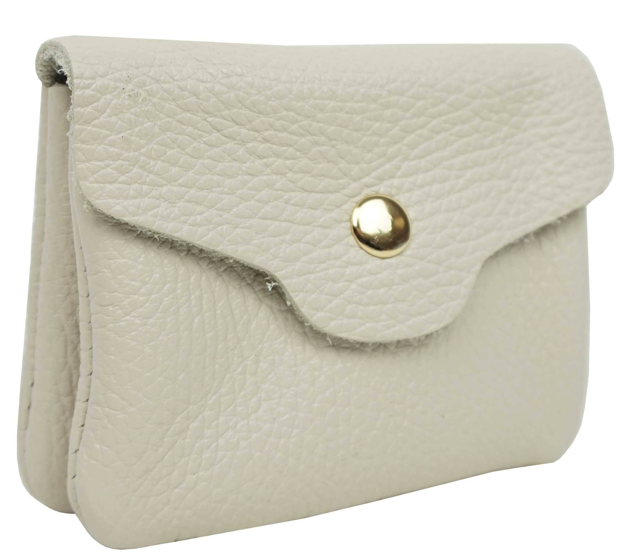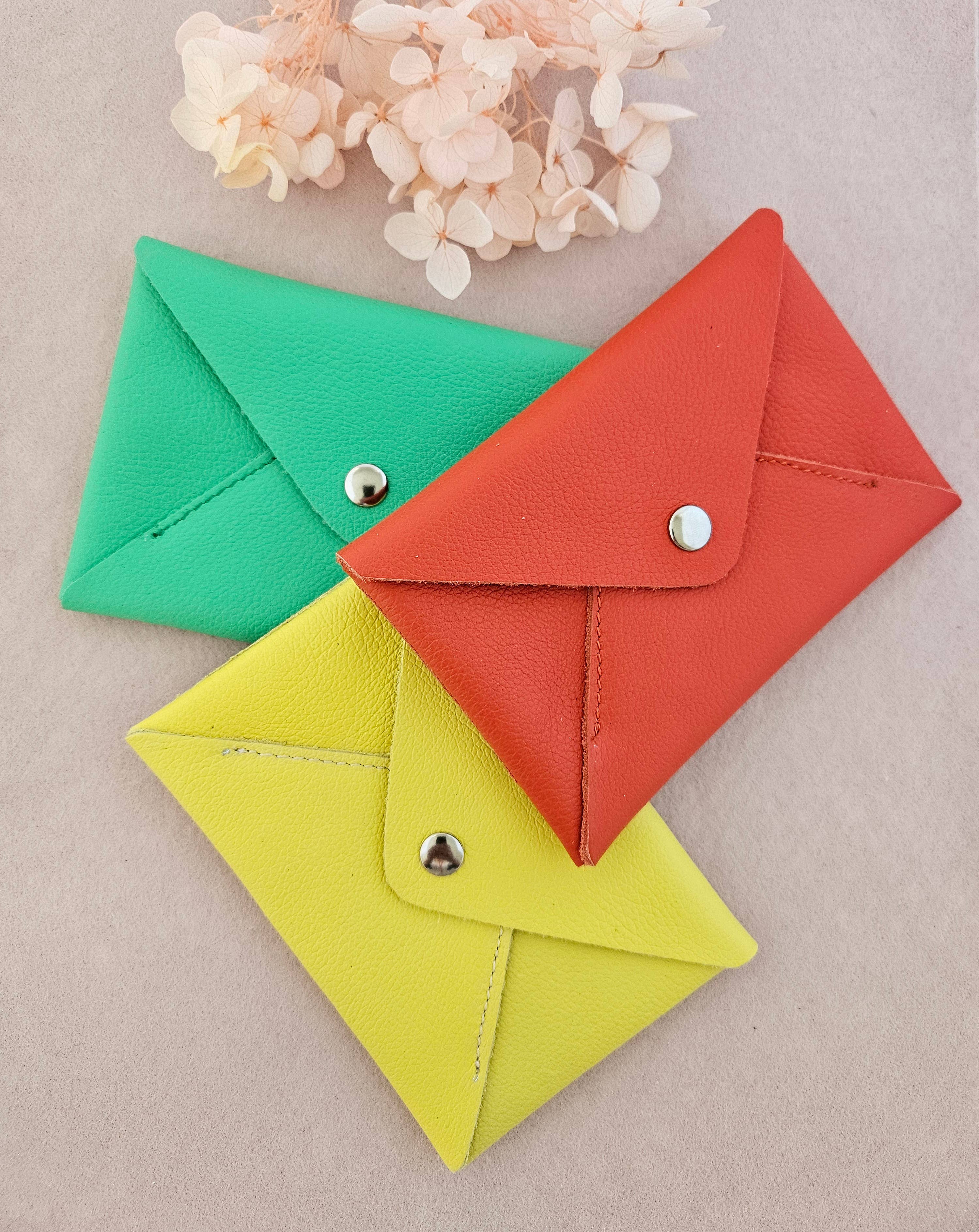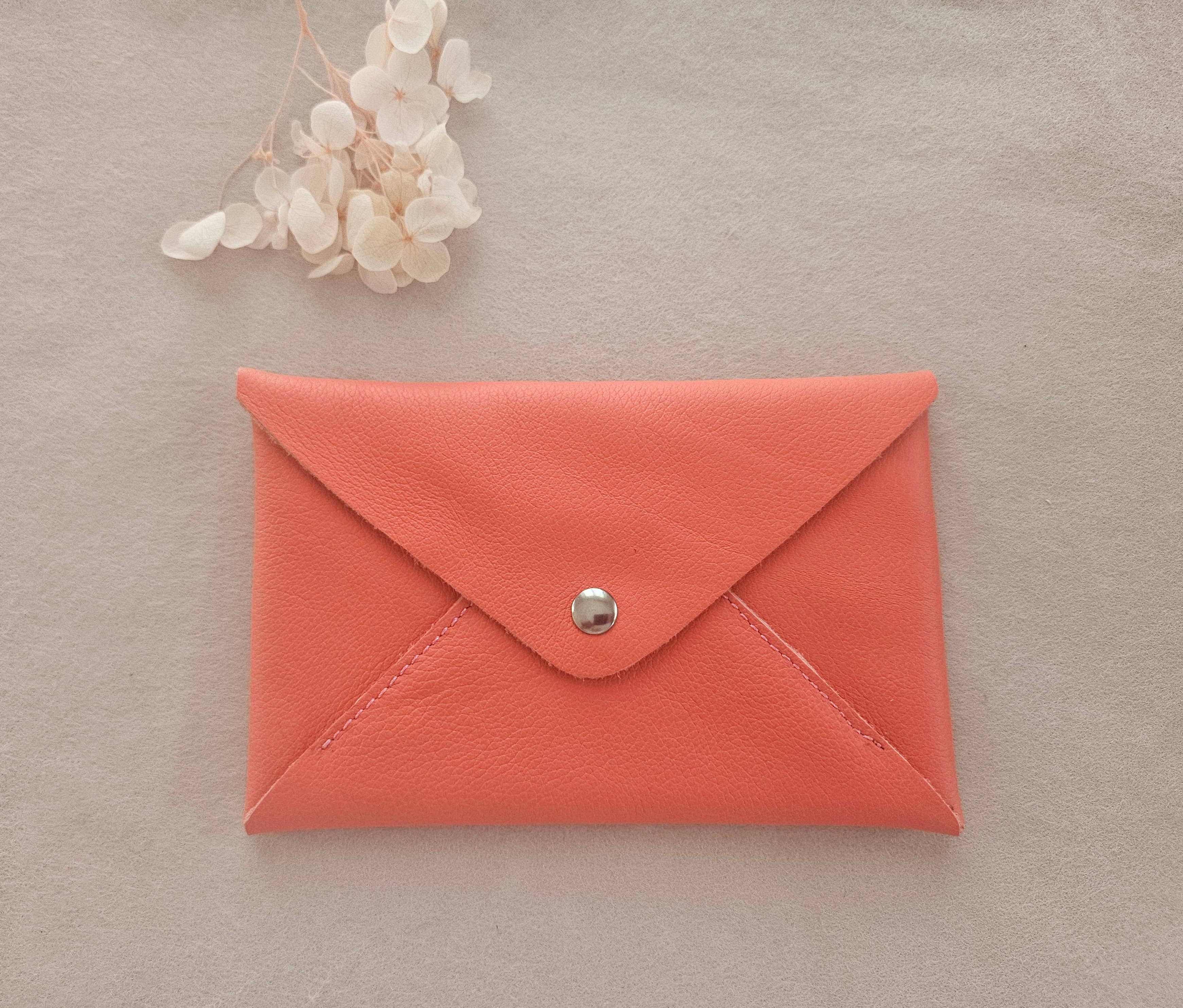 - portamonete in pelle, - (scarti di pelle di grandi marche) - forma a busta, bottone a pressione argentato - formato carta d'identità - 8,5X12,5 cm (I colori possono variare leggermente da un pezzo all'altro).