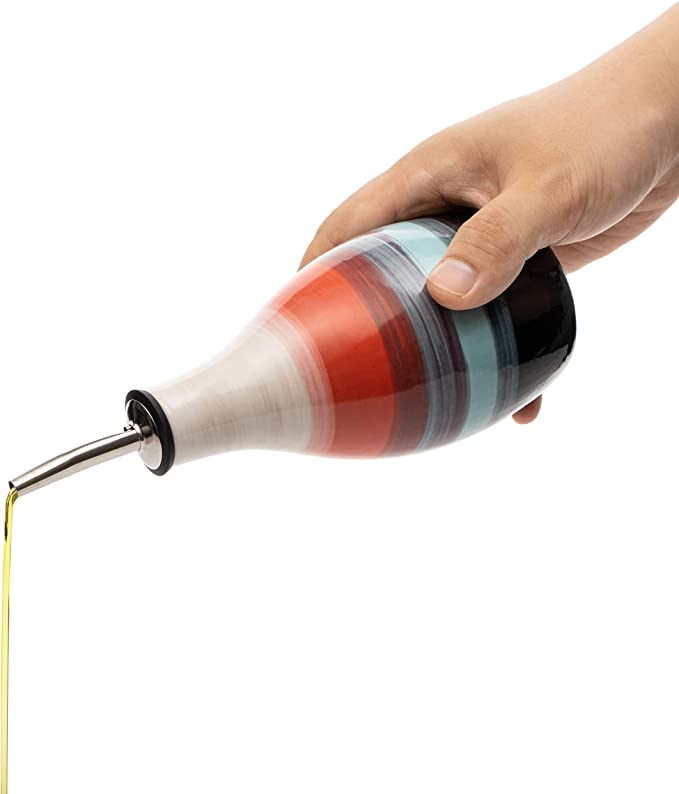 Questo dispenser in ceramica è perfetto per gli amanti di olio e aceto! Questa oliera in ceramica fatta a mano da Gute è un pezzo originale di artigianato. Pratico e attraente, il contenitore per olio d'oliva e aceto balsamico ha un'ampia bocca che offre un flusso generoso del tuo condimento preferito, mentre il serbatoio profondo può contenere una quantità sufficiente per lunghi utilizzi tra un riempimento e l'altro. Robusto e funzionale, questo dispenser diventerà un elemento essenziale in cucina. La bottiglia da tavola Gute è un oggetto originale e divertente che rende la preparazione culinaria semplice e piacevole. Il dispenser in ceramica presenta un beccuccio unico in acciaio inox, che consente di versare direttamente nel piatto la combinazione di olio, aceto e cibo con una leggera pressione.