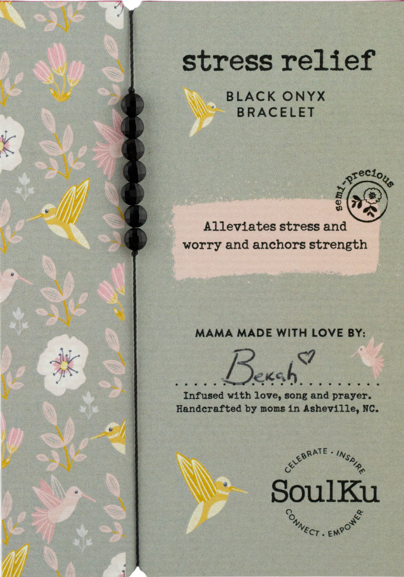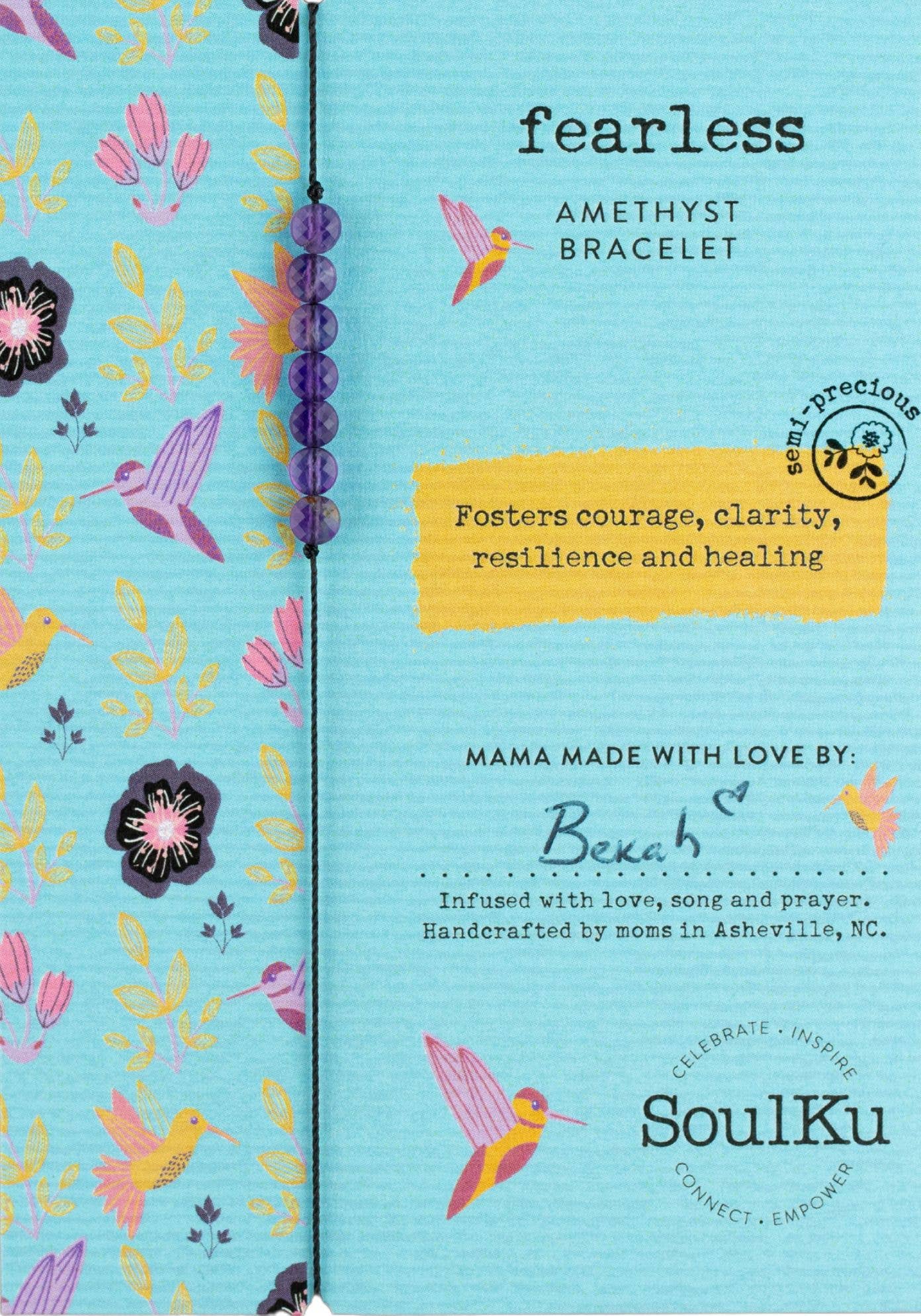 Questo bellissimo braccialetto Colibrì presenta Apatite per amplificare la creatività, l'espressione e l'ispirazione—un promemoria che tutto è possibile. Indossalo da solo o impila diversi—il braccialetto perfetto per tutti i giorni! Misura Regolabile Sette gemme semipreziose di circa quattro millimetri infilate su un cordoncino nero con cursore a nodo scorrevole Cartoncino Certificato FSC Di proprietà e gestito da donne a Asheville, NC dal 2011, SoulKu offre gioielli con gemme autentiche fatti a mano dal nostro team di mamme artigiane. Il regalo perfetto per compleanni, San Valentino, Pasqua, Festa della Mamma, festività e altro ancora—fai scorta di SoulKu questa stagione!