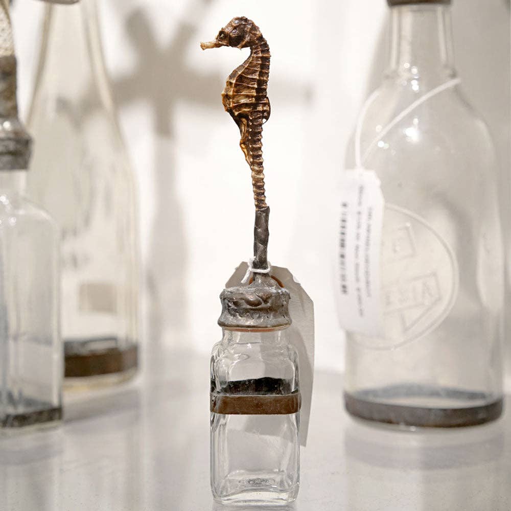 Questa bottiglia di vetro trasparente impreziosita da corallo blu e bianco mostra una bellezza naturale. Mettilo da solo o abbinalo a un altro dei nostri galleggianti o bottiglie per dare un tocco in più all'arredamento della tua casa. DIMENSIONI (circa): 13 POLLICI H 9" W 5" D I pezzi delle nostre collezioni sono realizzati a mano utilizzando fauna marina naturale, pietre geode, minerali o cristalli selezionati a mano da Jamie. Sono tutti unici nell'aspetto e possono variare leggermente per carattere, dimensione, colore, ecc. Non ce ne sono due uguali, il che rende il tuo pezzo di Jamie Dietrich davvero un'opera d'arte da collezione unica.