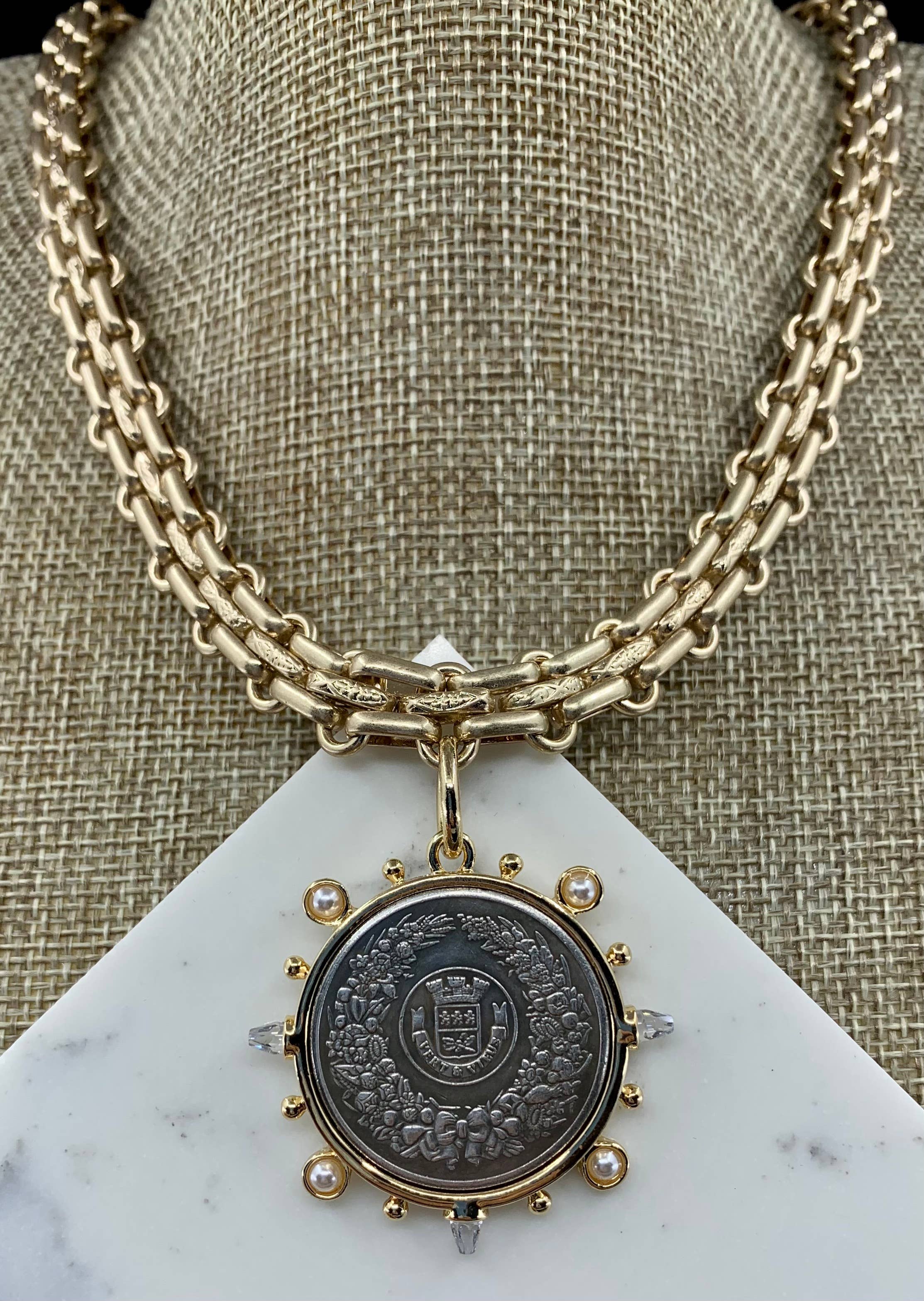 Ciondolo L'abielle Bee Coin - di ispirazione vintage Il collo è composto da diversi stili di catena Lunghezza totale 18"