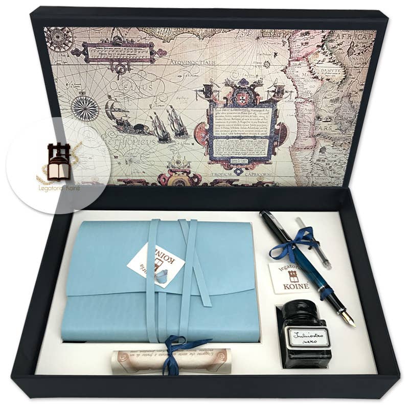 Set scrittura in scatola regalo: - Penna con canotto in legno, puntale in metallo decorato e pennino; - 2 pennini di ricambio - Flacone di inchiostro 50 cc. (inchiostro NON incluso nella bottiglia) - Diario in stile Medioevalis, in vero CUOIO morbido marrone anticato e laccio lungo. Dimensione: cm 12xH16. Tipo di CARTA: 128 fogli senza righe, color avorio, gr. 100/m2, non acida.