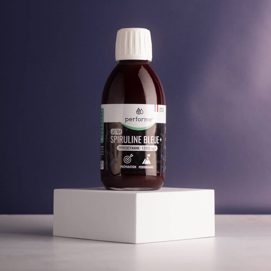 Integratore alimentare liquido Blue Spirulina+ Resistenza e recupero mirati Altamente concentrato in ficocianina a 6000 mg/l per una cura di 20 giorni Estrazione certificata a freddo e senza solventi dalla spirulina fresca Prodotto nel sud della Francia Conservare in luogo fresco dopo l'apertura.