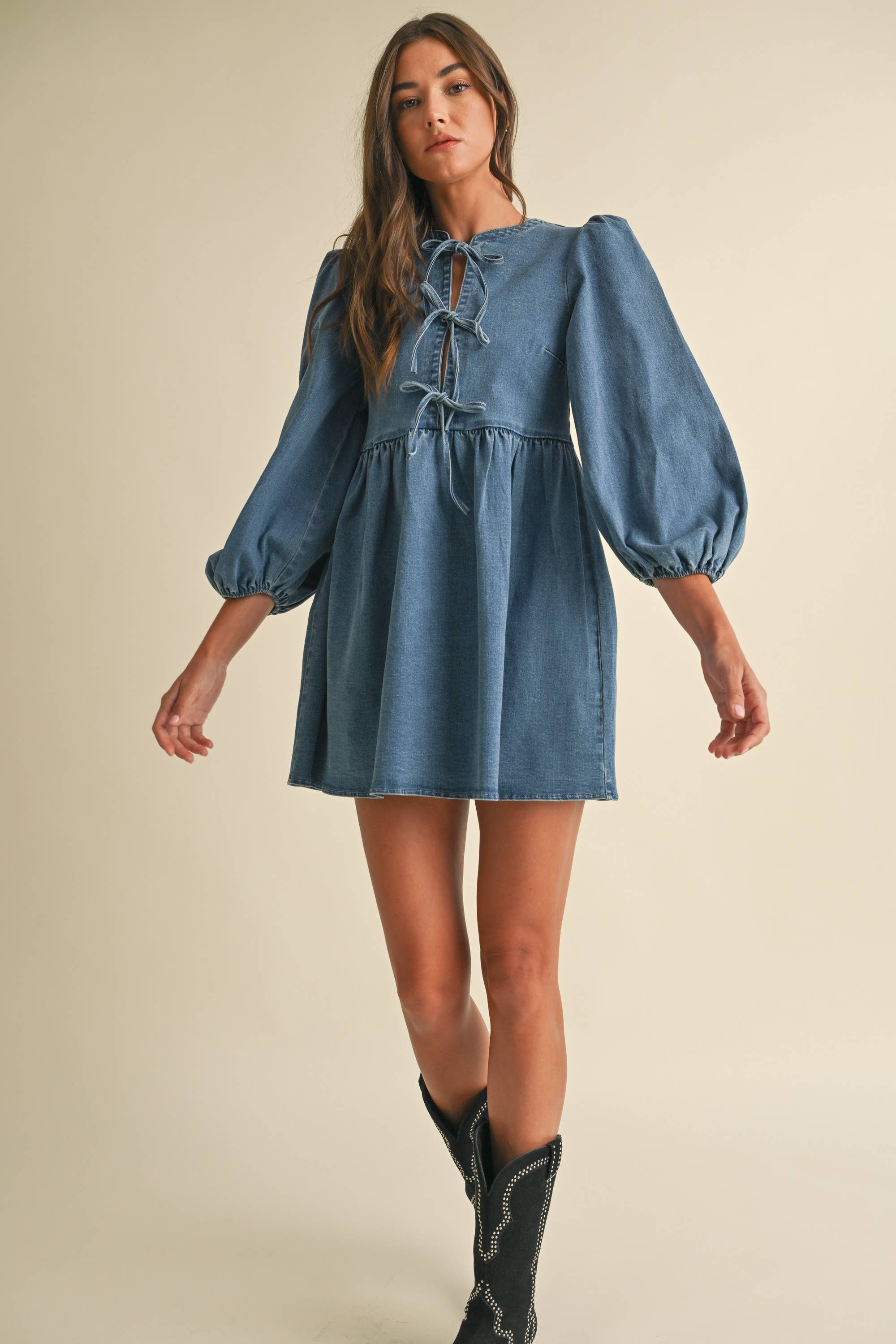 LD1727 Abito in Denim Autunnale con Maniche a Sbuffo e Dettaglio con Fiocco Frontale